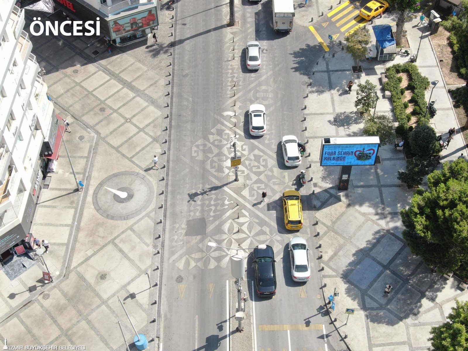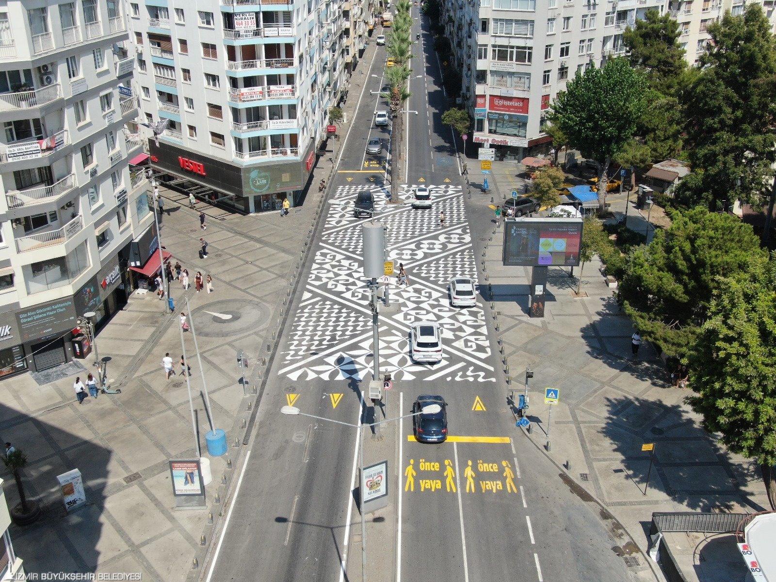 İzmir Büyükşehir Belediyesi, yaya trafiğinin en yoğun olduğu bölgelerden Alsancak Talatpaşa Bulvarı’nda, Kıbrıs Şehitleri Caddesi’ni Dominik Caddesi’ne ve Ali Çetinkaya Bulvarı’na bağlayan aksta yaptığı yaya öncelikli platformu yeniledi. 34 metre uzunluğunda, Avrupa’daki örneklerine benzer yaya platformu, cuma günü kapılarını açacak 94. İzmir Enternasyonal Fuarı öncesinde yeniden boyandı ve çizgiler belirgin hale getirildi. Oluşacak yaya sirkülasyonu öncesinde tamamlanan yaya platformu İzmir temalı figüratif desenlerden oluşuyor. Engelli ve yaşlı vatandaşların erişimi göz önünde bulundurularak yol ve kaldırımların aynı seviyede olduğu platformla yaratılan mini meydan, görsel açıdan da kente renk katıyor.