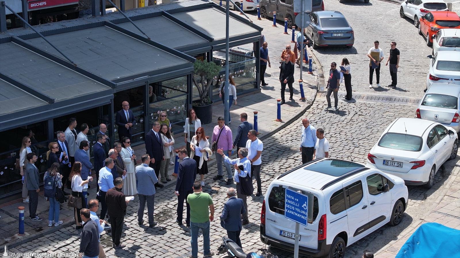 Dr. Öğretim Üyesi Pelin Özden yürütücülüğünde hazırlanan program kapsamında Gündoğdu Meydanı ile Cumhuriyet Meydanı arasında kalan ve denize açılan beş sokakta; mevcut yaya ve araç trafiği koşulları değerlendirildi. İzmirlilerin Kordon’a rahat ve güvenli erişimi ile alanın en katılımcı şekilde kullanılmasını sağlayacak senaryolar görüşüldü. İnceleme sonrasında keşif notları alan katılımcılar, notları İZPA yetkililerine teslim etti. İZPA tarafından yürütülen çalışmayla Kordon’u rahatlatacak düzenlemeler için en uygun yol haritası oluşturulacak.