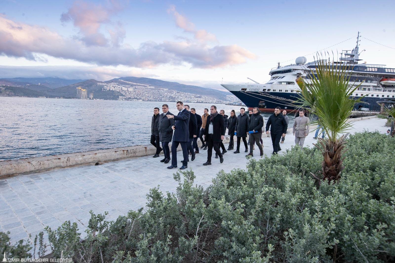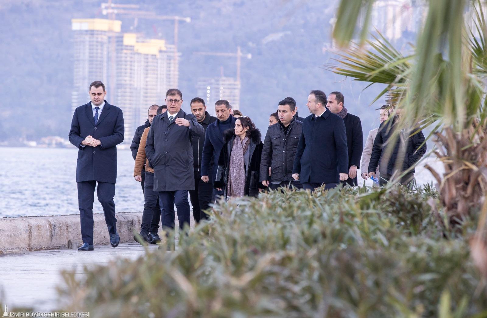 İzmir Büyükşehir Belediye Başkanı Dr. Cemil Tugay, Alsancak Kordon’da deniz taşkınlarını önlemek için başlatılan, aynı zamanda sosyal donatı alanlarıyla kıyı şeridindeki sorunları çözerek estetik bir görünüme kavuşturacak “Kordon Acil Eylem Paketi” çalışmalarını yerinde inceledi. Alsancak Limanı’ndan Cumhuriyet Meydanı’na kadar uzanan çalışma hakkında sahada bilgi alan Başkan Dr. Cemil Tugay’a İzmir Büyükşehir Belediyesi Genel Sekreter Yardımcısı Çağatay Güç, Fen İşleri Dairesi Başkanı Sercan Kahya, Yapı İşleri Dairesi Başkanı Onur Açık, Park ve Bahçeler Dairesi Başkanı Müge Deniz Bal ve birim yöneticileri eşlik etti. Kordon boyunca yürüyen Başkan Tugay, alanda yapımı tamamlanan geçici fırtına duvarını, acil durum kapılarını, zemin ve peyzaj düzenlemelerini teker teker inceledi.