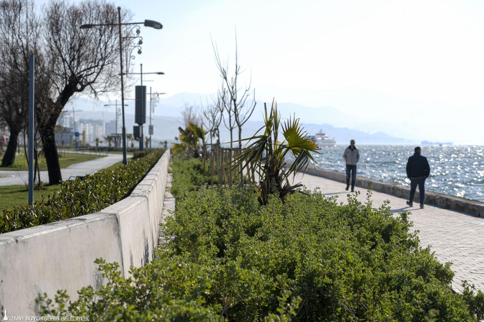 İzmir Büyükşehir Belediyesi peyzaj düzenlemelerinde deniz semizi, zakkum, defne, Arap yasemini, akkavak, ılgın ve palmiye bitkilerini kullandı. Bitkilerin sulanması için alana sulama tesisatı kuruldu. Park ve Bahçeler Dairesi Başkanlığı Güney Alanlar Şube Müdürlüğü Şefi Umut Gök, çalışmalar kapsamında Kordon’a 6 bin metrekare yeni yeşil alan kazandırıldığını söyledi. Gök, 10 bin 440 metrekarelik bir peyzaj alanına 43 bin çalı bitkisi ile 185 adet ağaç diktiklerini aktararak, 8 bin 100 metrekarelik alanda çim seriminin devam ettiğini bildirdi. Seçilen bitkilerin tuzlu suya dayanıklı bitkiler olduğunu aktaran Gök, “Geçmiş dönemlerde yaşadığımız taşkınlarda tüm peyzaj alanlarımız, yeşil alanlarımız tahrip olmuştu. Bu tahribatı önlemek adına daha çok tuzlu suya dayanıklı bitkileri tercih ettik” dedi.