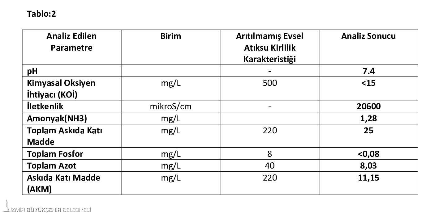 Laboratuvardan alınan analiz sonuçlarının değerlendirme bölümünde “Arıtılmamış evsel atık su kirlilik karakteristiği parametre değerleri ile karşılaştırıldığında evsel atık su olmadığı açıkça görüldü. Ayrıca iletkenlik parametresinin analiz değerinden de görüldüğü üzere deniz suyu karakterinde de olduğu görülmekte” ifadelerine yer verildi.