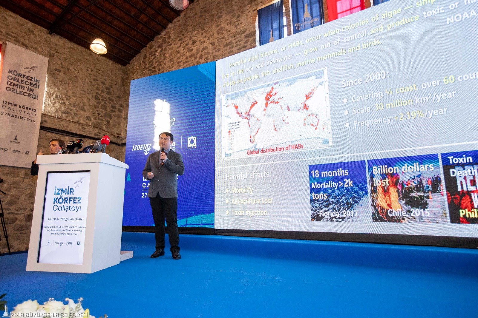 İzmir Büyükşehir Belediyesi’nin körfezdeki alg patlamalarına karşı acil müdahale yöntemi olarak gündeme getirdiği modifiye kil yöntemi hakkında Çin Bilimler Akademisi Oşinoloji Enstitüsü’nden (IOCAS) Dr. Isaac Yongquan Yuan dikkat çekici açıklamalar yaptı. Dr. Yuan, bu yöntemin İzmir Körfezi'nde balık ölümlerine yol açan alg patlamalarına karşı “yangın söndürücü” rolü oynayabilecek en doğal ve çevreci acil müdahale aracı olduğunu söyledi.