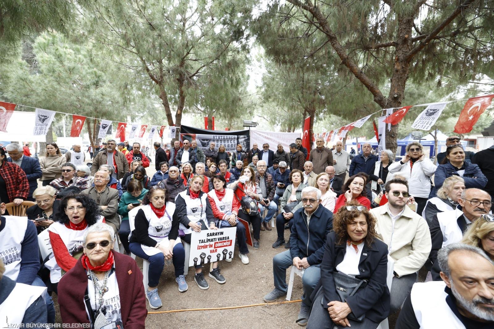 Tüm ADD şubeleri ve üyeleri adına destek mesajı veren ADD Genel Başkanı Dr. Mustafa Hüsnü Bozkurt, “Bugün, daha önceden planladığımız Atatürkçü Düşünce Derneği İzmir şubeleri toplantısını maalesef burada yapmak gereği duyduk. Osmanlı döneminden kalma un fabrikası olan, 1926 yılında Atatürk’ün emriyle İzmir Büyükşehir Belediyesi mülkiyetine verilen Meslek Fabrikası binası için buradayız. 9 Eylül’de Türk ordusu İzmir’e girdiğinde burada kurulan tuzak sonucu açılan ateşle Mehmetçiklerimiz şehit oldu. Hadi Gazi Mustafa Kemal Atatürk’ten utanmadınız, şehitlerden de mi utanmadınız? O askerlerimizin şehit olduğu yerde şimdi maalesef İzmirliler 24 saat nöbet tutuyorlar. Atatürk’ün kendilerine verdiği yer ellerinden alınmasın diye nöbet tutuyorlar. Biz de Atatürkçü Düşünce Derneği olarak eş güdüm toplantımızı burada yapıyoruz. Bütün Atatürkçü Düşünce Derneği şubeleri adına İzmir’den sesleniyoruz. Bu hukuksuz kararın, yanlış karardan vazgeçilmesini istiyoruz” ifadelerini kullandı.