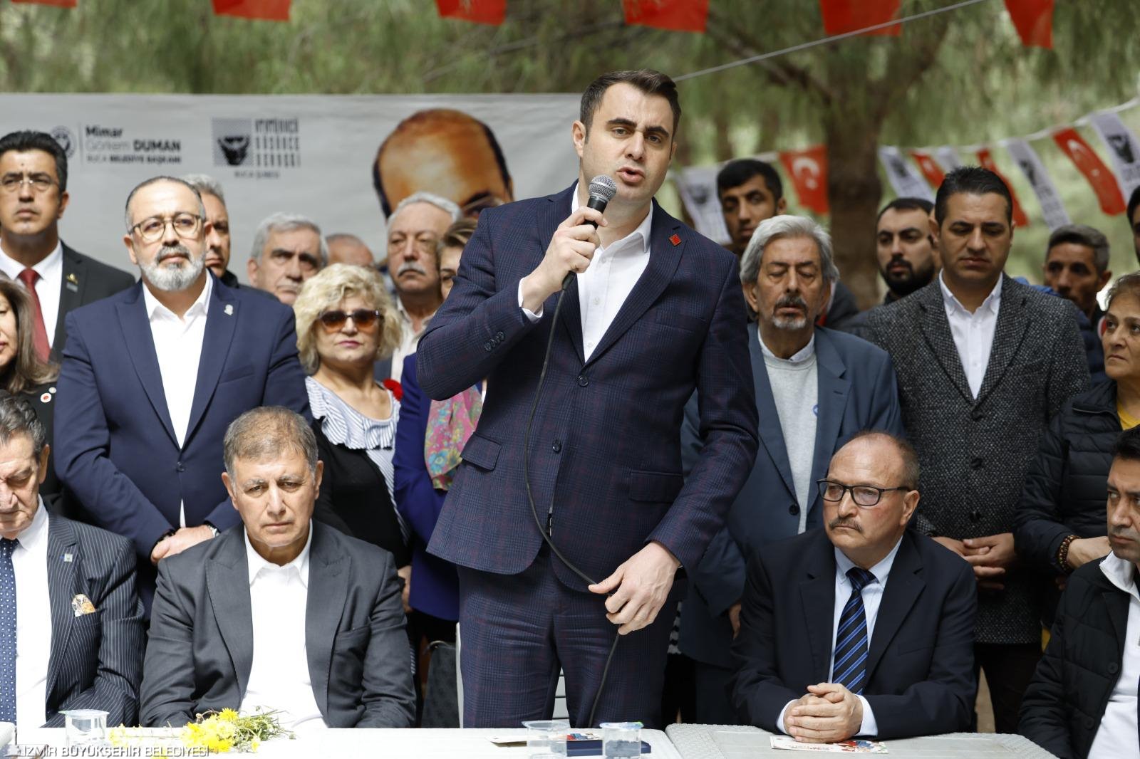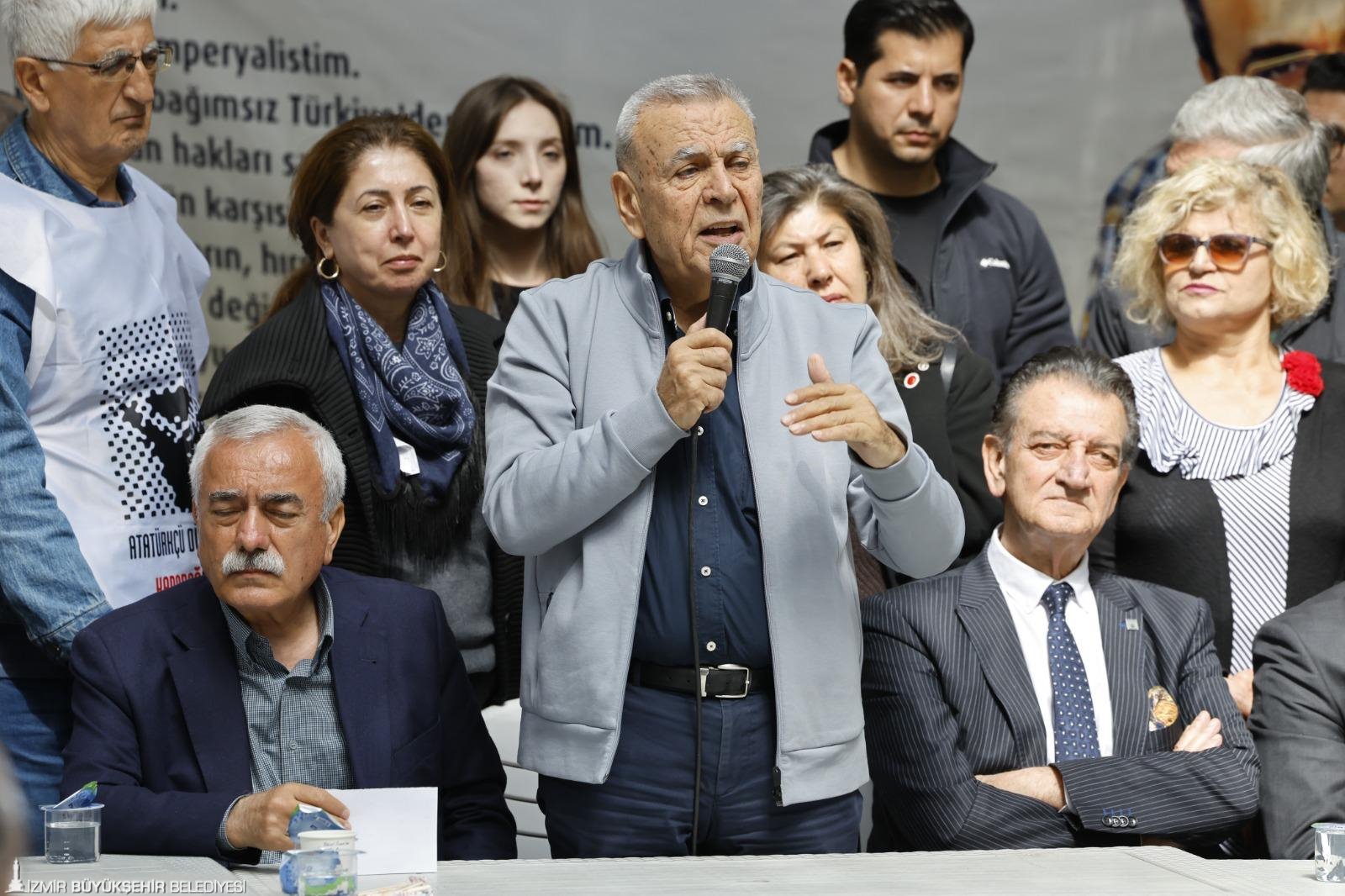 Tüm İzmirlilere seslenen Başkan Tugay, “Bir avuç insan burada toplanıyor bir şeyler konuşuyorlar diyorlar. Sokakta duyuyorum, iki kişiden birisi gelip biz olaydan haberdarız, doğru bulmuyoruz, haklı tepkinizde yanınızdayız, gelemiyoruz, gidemiyoruz ama yanınızdayız diyorlar. Buraya gelemeyenlere söylüyorum, bulunduğunuz her yerden, her şekilde hem bu hukuksuzluğa, bu yalana dolana hem de maruz kaldığınız her türlü haksızlığa karşı sesinizi çıkarın, itiraz edin, bir şeyler söyleyin. Adaletsizlik ve kötülük normalleşmemeli. Kimse bunu normal olarak görmemeli. Bu anormal bir durum ve bunun devamında yeni anormallikler herkesi bekliyor. Bu sistem bir avuç insanın işine yarıyor ama halkın tamamı perişan oluyor. Ondan dolayı çocuklarımız bu ülkeden umudunu kestiler. Bizim insanlarımız neden bu kadar sessiz diyorlar ve bu ülkeden gidiyorlar. O yüzden kötülüğü kabullenmeyin. Kötülüğü bu ülkede kimse kabullenmesin” şeklinde konuştu.