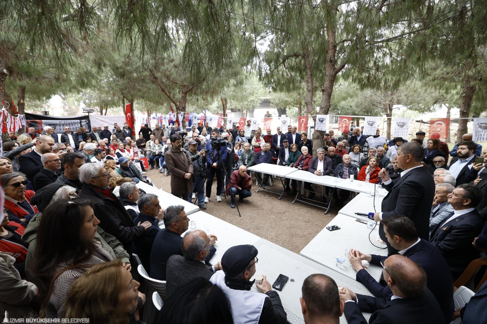Toplantıda konuşan Başkan Dr. Cemil Tugay, “Burada olmanız bizim için çok değerli ve anlamlı. Bize cumhuriyeti miras bırakan Ata’mızın İzmir’e armağan ettiği bir bina. En azından bu mirasa, İzmir’in şehitlerine saygılı bir duruş göstermeleri gerekirdi. Türkiye’de ilk defa bir kamu kurumu başka bir kamu kurumuyla mülkiyet tartışması yaşıyor. Normalde iki ayrı kurumun bir şekilde hukuk zemininde uzlaşması gerekirken, bina sabahın 5’inde polis baskınıyla ablukaya alınıyor. Bu hukuksuz tavra karşı sessizce buradan çıkıp gitmemizi söylediler. Bunu yapamadık. Bu konu sadece İzmir Büyükşehir Belediye Başkanının sorunu değil. Sadece bir mülkiyet sorunu da değil. Bu, büyük bir saygısızlık. İzmir halkına ait olan herhangi bir mülke devlet kurumu da olsa bu şekilde el konulamaz. Türkiye’nin pek çok şehrinde benzer durumu görüyoruz. Bu hukuksuzluk, devlet geleneğine saygısızlık, halkın hakkına saygısızlık normalleştirilmeye çalışılıyor” ifadelerini kullandı.