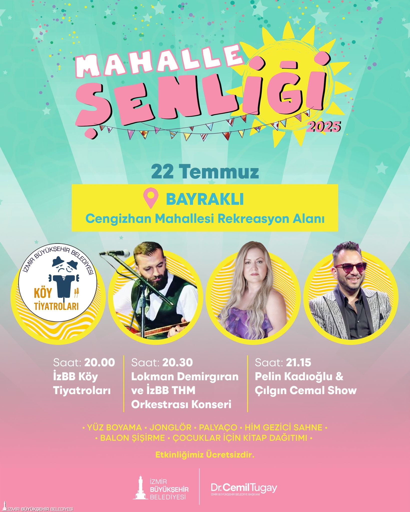 İzmirli yurttaşlar, İzmir Büyükşehir Belediyesi Kültür ve Sosyal İşler Dairesi Başkanlığı organizasyonunda düzenlenecek Mahalle Şenliği ile eğlenceli etkinliklerle buluşacak. Mahalle Şenliği, 22 Temmuz’da Bayraklı Cengizhan Mahallesi Rekreasyon Alanı, 29 Temmuz’da Beydağ Cumhuriyet Mahallesi 2 Eylül Kurtuluş Parkı, 5 Ağustos’ta Bergama Cumhuriyet Meydanı, 12 Ağustos’ta Ödemiş Kültürpark Zafer Mahallesi, 19 Ağustos’ta Kemalpaşa Rekreasyon Alanı ve 26 Ağustos’ta Aliağa Siteler Mahallesi Şehit Oğuz Özgür Çevik Parkı’nda gerçekleştirilecek.