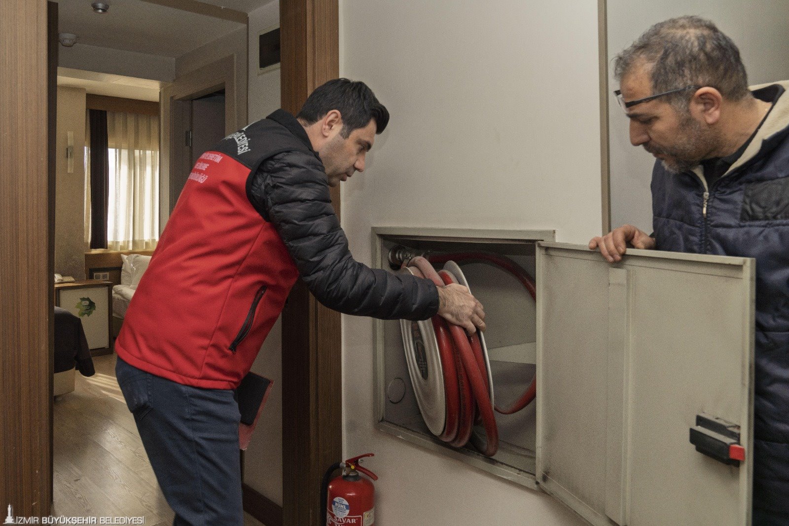 İzmir Büyükşehir Belediyesi İtfaiye Daire Başkanlığı, otellere yönelik denetimlerini sıklaştırdı. Binaların Yangından Korunması Yönetmeliği kapsamında yangın merdivenleri, acil çıkış kapıları, yön bulma tabelaları ile duman algılayıcı gibi birçok hayati önlem titizlikle inceleniyor. Eksik görülenler tutanak altına alınarak işletmelere bunların giderilmesi için süre veriliyor.