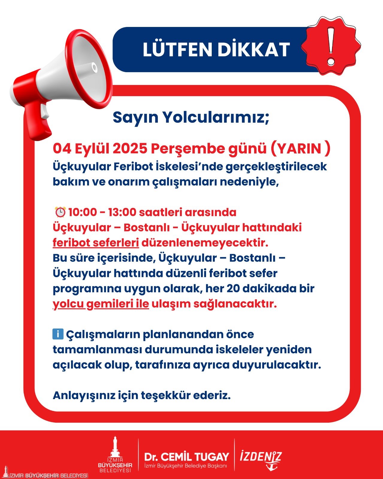 Üçkuyular Feribot İskelesi’nde gerçekleştirilecek bakım ve onarı çalışması nedeniyle 4 Eylül 2025 Perşembe günü saat 10.00 ile 13.00 saatleri arasında Üçkuyular-Bostanlı-Üçkuyular hattındaki feribot seferleri düzenlenemeyecek.