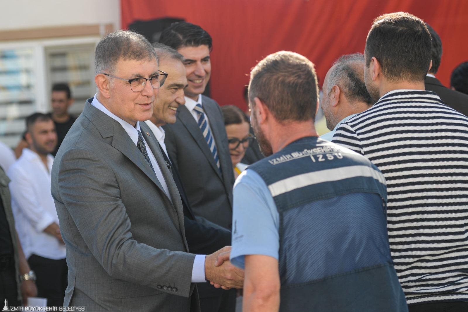İzmir Büyükşehir Belediye Başkanı Dr. Cemil Tugay, güne İZSU Genel Müdürlüğü çalışanlarının Kurban Bayramı'nı kutlayarak başladı. İZSU Karabağlar Şantiyesi'nde işçilerle buluşan Başkan Dr. Tugay’a İzmir Büyükşehir Belediye Başkan Vekili Dr. Levent Zafer Yıldır, İzmir Büyükşehir Belediyesi Genel Sekreter Yardımcısı Prof. Dr. Pınar Okyay, İZSU Genel Müdürü Gürkan Erdoğan ile İZSU Genel Müdür yardımcıları ve daire başkanları da eşlik etti.