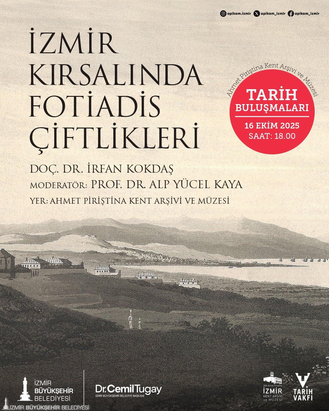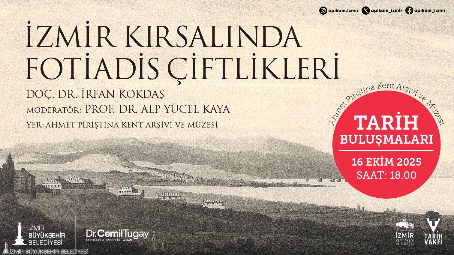APİKAM’ın Tarih Vakfı ile düzenlediği “Tarih Buluşmaları” söyleşi dizisi, İzmir Kâtip Çelebi Üniversitesi Sosyal ve Beşeri Bilimler Fakültesi Tarih Bölümü Öğretim Üyesi Doç. Dr. İrfan Kokdaş konukluğunda devam ediyor. Moderatörlüğünü Ege Üniversitesi İktisadi ve İdari Bilimler Fakültesi İktisat Bölümü Öğretim Üyesi Prof. Dr. Alp Yücel Kaya’nın üstleneceği “İzmir Kırsalında Fotiadis Çiftlikleri” başlıklı söyleşi,16 Ekim Perşembe günü 18.00-19.30 saatleri arasında APİKAM Konferans Salonu’nda gerçekleştirilecek. İrfan Kokdaş söyleşide, genellikle liman ve Kordon çevresine, şehrin “kozmopolit” nüfus yapısına odaklanan İzmir tarihi anlatısından farklı bir perspektif ortaya koyacak. Akademisyen, İzmir’in aslında büyük bir tarım hinterlandının göbeğinde bulunduğuna ve bu durumun yarattığı sonuçlara dikkat çekecek.
