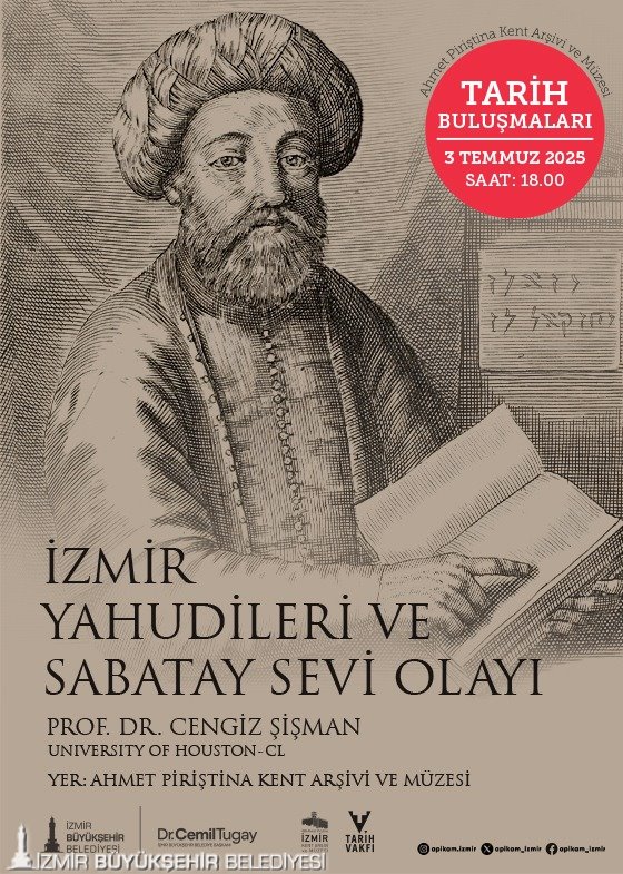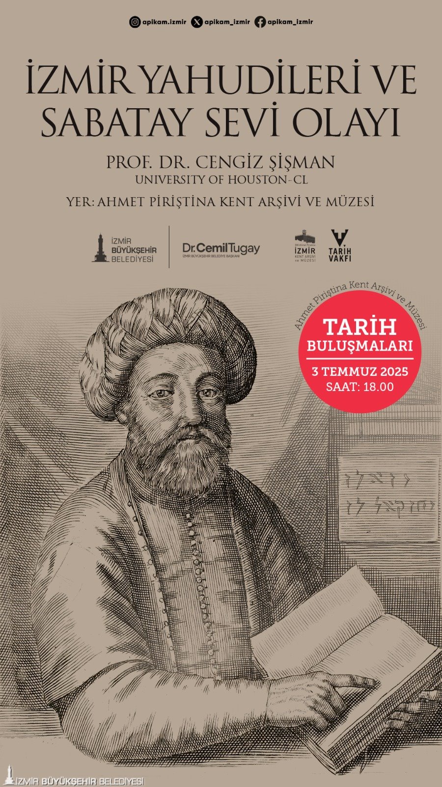 Ahmet Piriştina Kent Arşivi ve Müzesi’nde (APİKAM) “Tarih Buluşmaları”, “İzmir Yahudileri ve Sabatay Sevi Olayı” oturumuyla devam ediyor. Houston-Clear Lake Üniversitesi’nde tarih profesörü olan Cengiz Şişman’ın katılımıyla gerçekleşecek söyleşi, 3 Temmuz 2025 Perşembe günü 18.00-19.30 saatleri arasında, Ahmet Piriştina Kent Arşivi ve Müzesi Konferans Salonunda düzenlenecek.