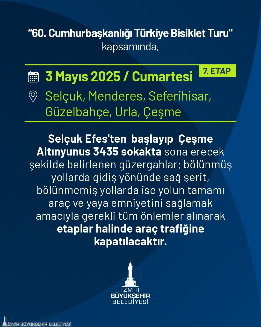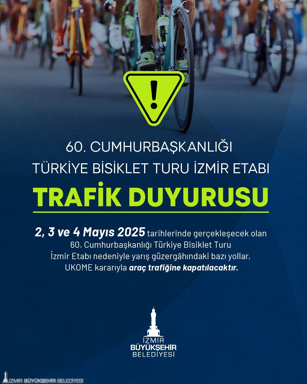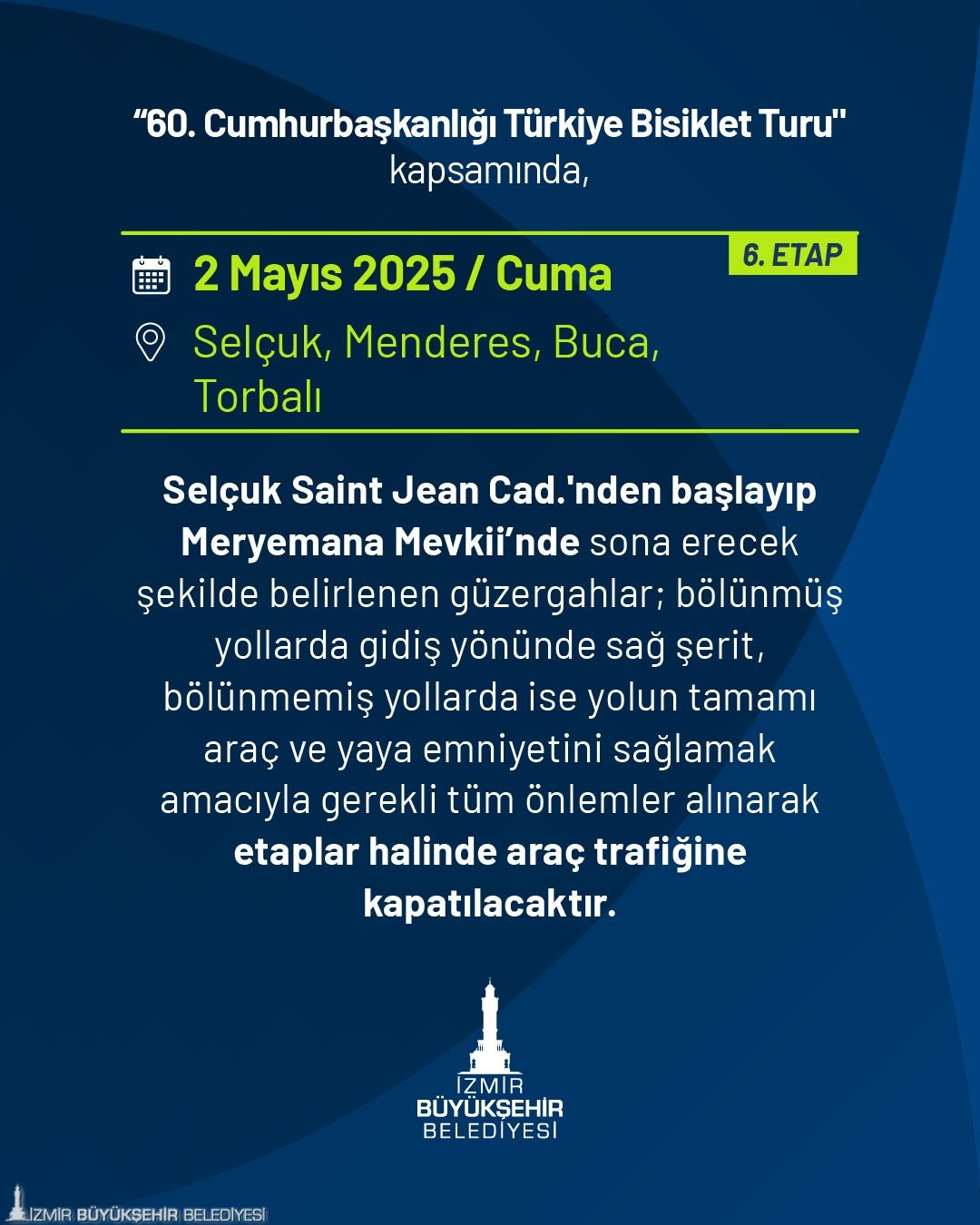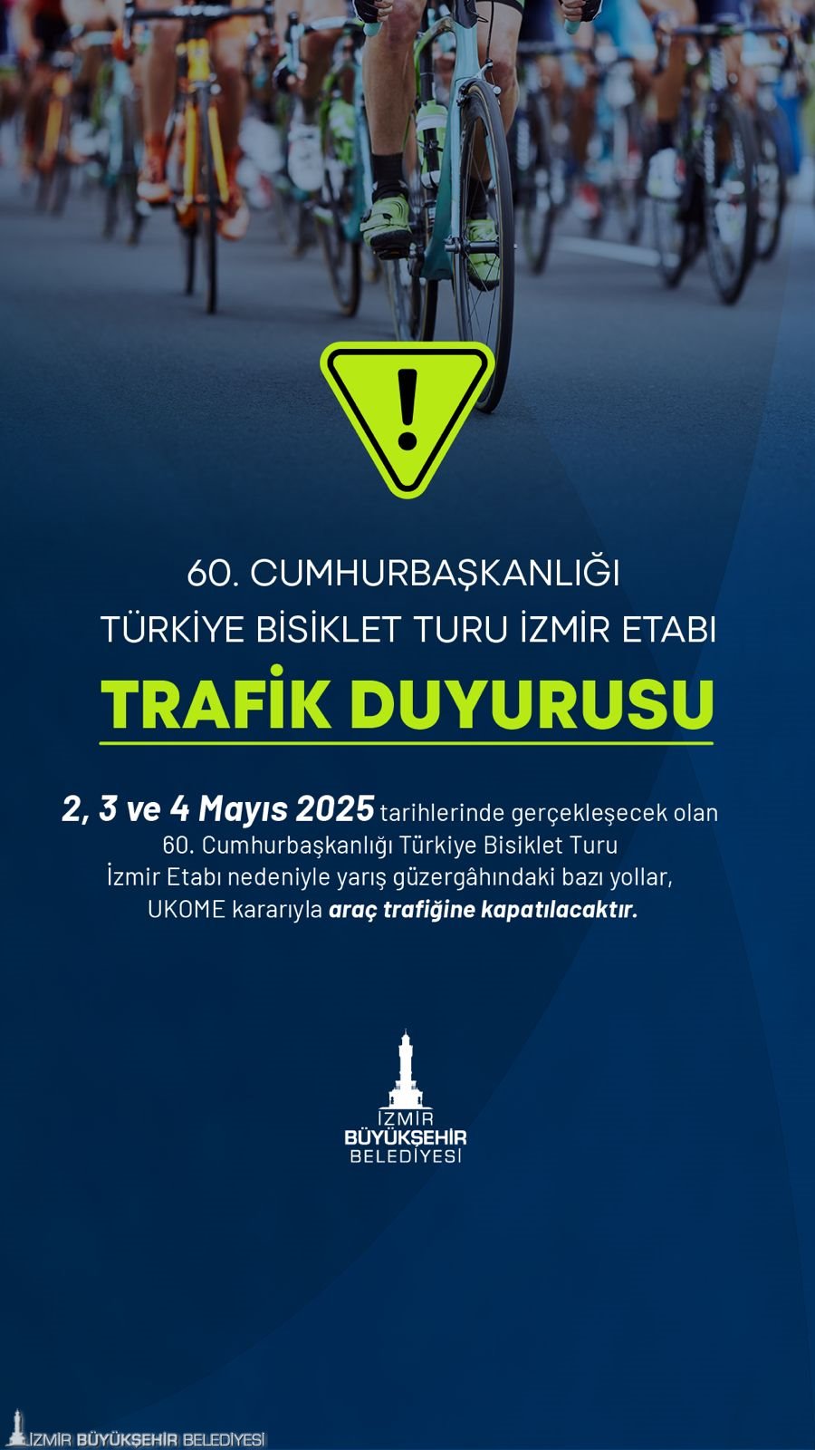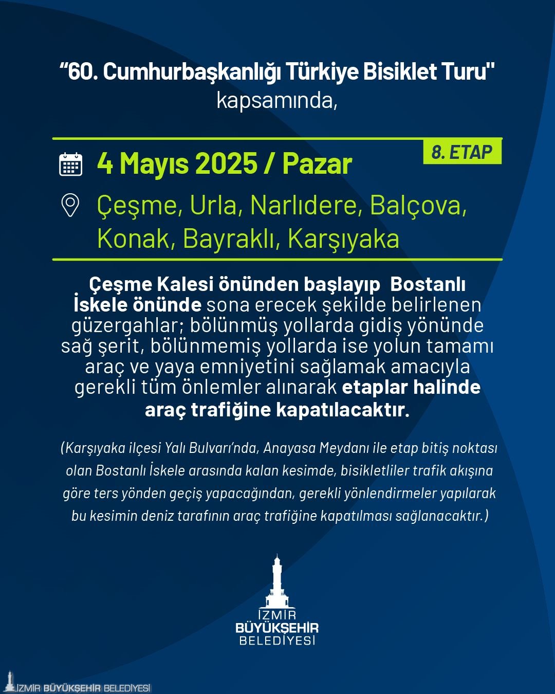 27 Nisan’da Antalya’da başlayan ve 4 Mayıs’ta İzmir’de sonlanacak 60. Cumhurbaşkanlığı Türkiye Bisiklet Turu’nun 6’ncı, 7’nci ve 8’inci etap güzergâhları Kuşadası, Menderes, Selçuk, Seferihisar, Çeşme, Urla, Güzelbahçe ve Konak’tan geçerek Bostanlı İskelesi’nde sonlanacak. Ulaşım Koordinasyon Merkezi’nin (UKOME) kararı uyarınca 2 Mayıs Cuma, 3 Mayıs Cumartesi ve 4 Mayıs Pazar günleri, İzmir’de yarış güzergahındaki yollar trafiğe kapalı olacak. Bu nedenle bazı ESHOT hatları ile Konak ve Karşıyaka tramvaylarının sefer planlarında zorunlu değişiklikler olacak.