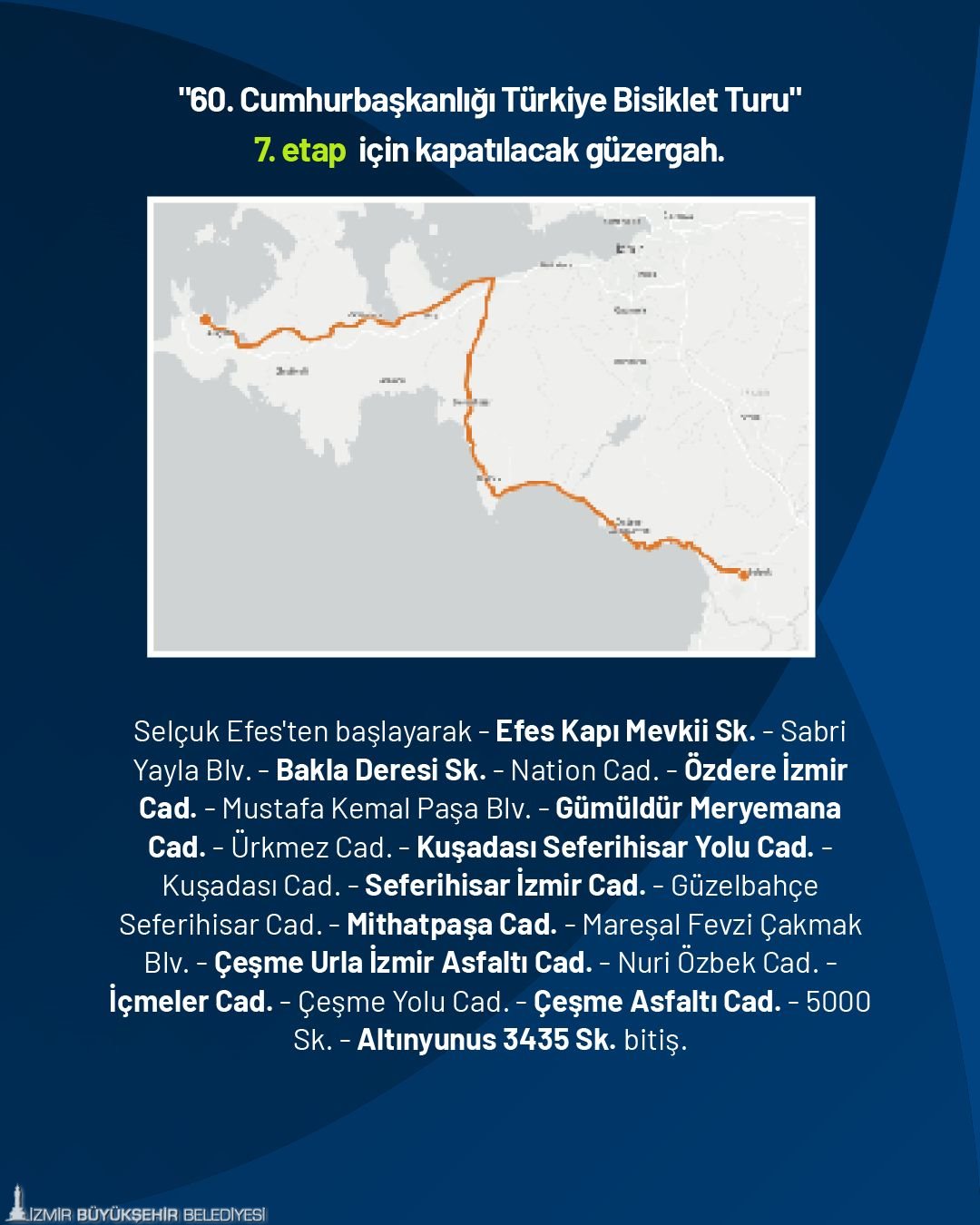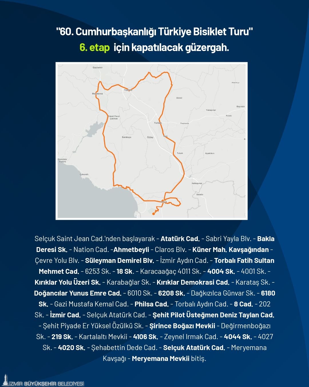 60’ıncı Cumhurbaşkanlığı Türkiye Bisiklet Turu’nun, İzmir sınırlarında düzenlenecek 6’ncı, 7’nci ve 8’inci etapları kapsamında kapanacak güzergâhlar şöyle olacak: