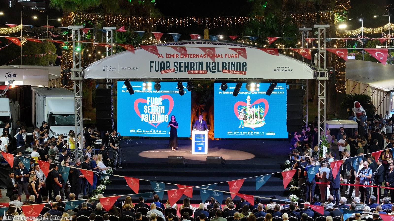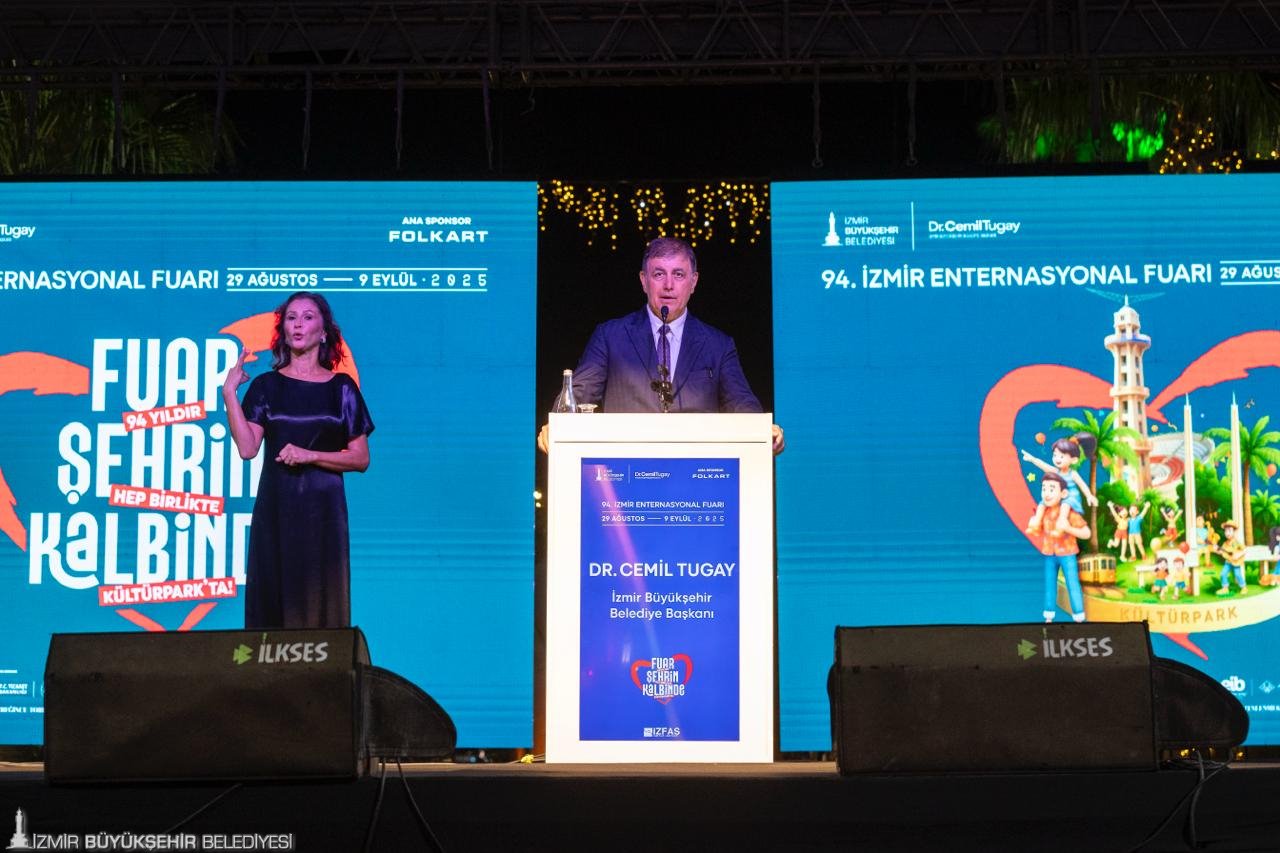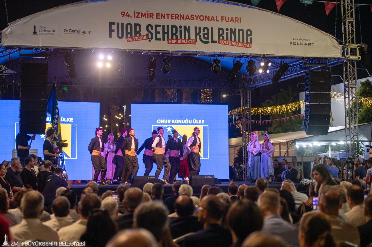 Türkiye’nin ilk fuarı, kentin kalbinde 94. kez kapılarını açtı. İzmir Büyükşehir Belediyesi ev sahipliğinde İZFAŞ tarafından “Fuar Şehrin Kalbinde” sloganıyla düzenlenen İzmir Enternasyonal Fuarı’nın (İEF) açılış töreni, Gündoğdu Meydanı'ndan Kültürpark'a gelen renkli kortejle başladı. İzmir Büyükşehir Belediyesi tarafından organize edilen 29-31 Ağustos tarihlerindeki Uluslararası Balkanlılar Halk Dansları Festivali ile eş zamanlı başlayan ve 9 Eylül’e kadar Kültürpark’ta ziyaretçilerini ağırlayacak İEF’nin İzmir Büyükşehir Belediye Başkanı Dr. Cemil Tugay ile eşi Öznur Tugay ev sahipliğindeki açılışına T.C. Ticaret Bakan Yardımcısı Özgür Volkan Ağar, onur konuğu ülke Bosna Hersek’in Büyükelçisi Mirsada Colakovic, Bosna Hersek İnsan Hakları ve Mülteciler Bakanı Sevlid Hurtic ve Bosna Hersek delegasyonu, CHP Kültür ve Turizm Bakanlığından Sorumlu Genel Başkan Yardımcısı Gülşah Deniz Atalar, Balıkesir Büyükşehir Belediye Başkanı Ahmet Akın ile eşi Arbil Akın, Cumhuriyet Halk Partisi (CHP) İzmir İl Başkan Vekili Barış Özdemir, milletvekilleri, siyasi partilerin temsilcileri, konsoloslar, büyükelçiler, ilçe belediye başkanları, odalar, birlikler, dernekler ile sivil toplum kuruluşlarının başkanları ve temsilcileri, İzmir Büyükşehir Belediyesi bürokratları, meclis üyeleri, basın temsilcileri ve vatandaşlar katıldı. Açılışta Bosna Hersek'in halk dansları ekibi ve drone ile uçan ekranların da gösterisi vardı.