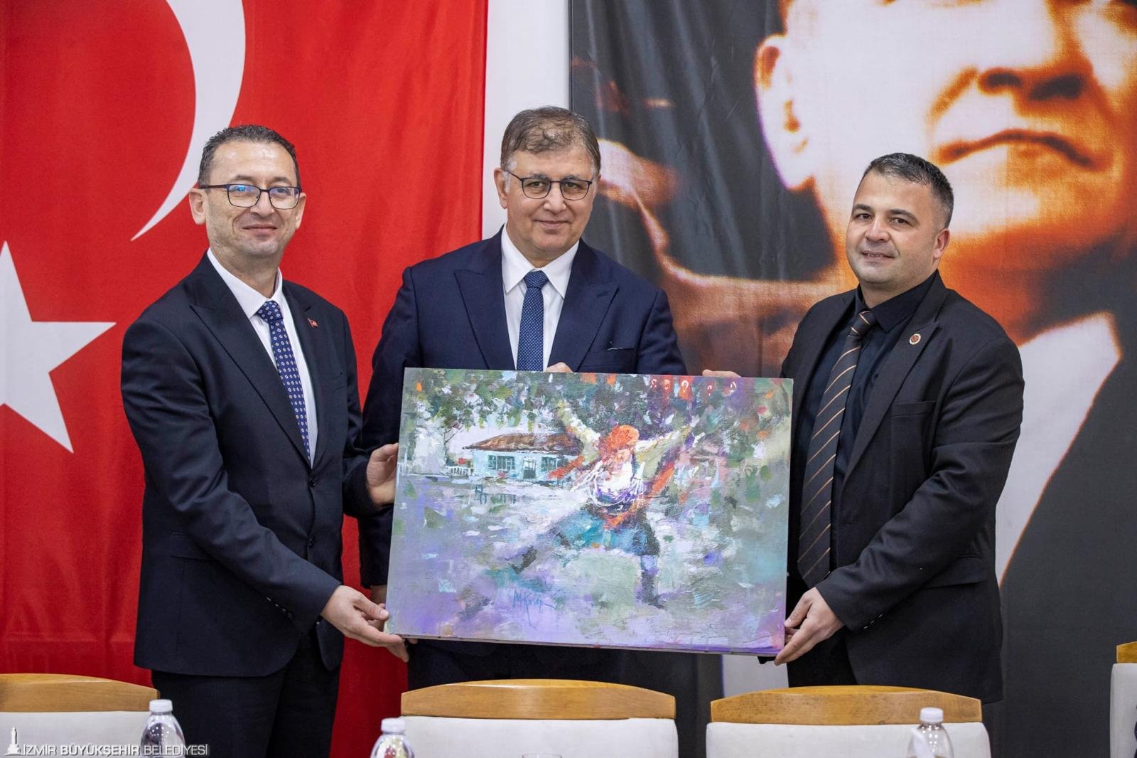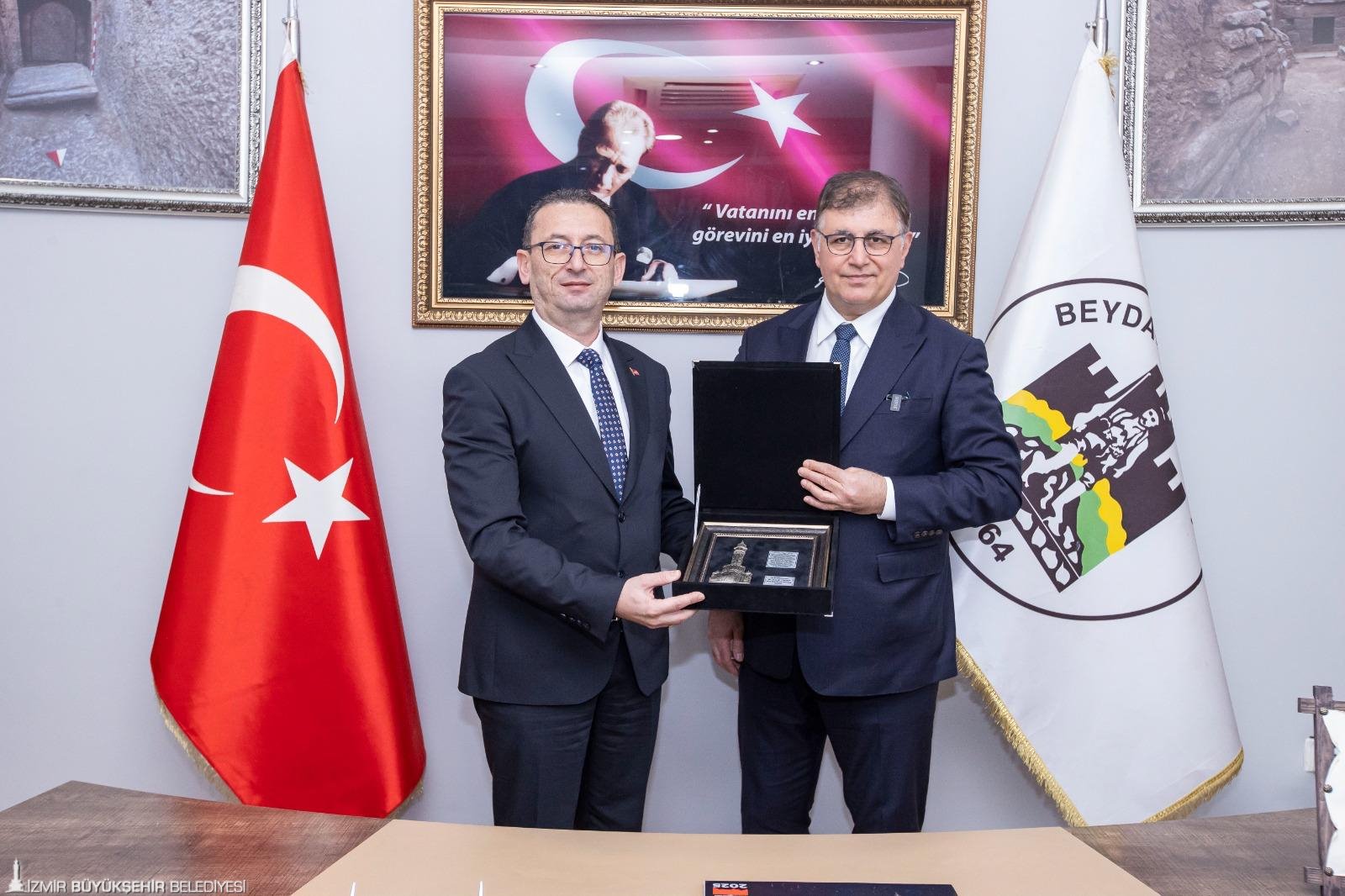Beydağ Muhtarlar Derneği Başkanı ve Atatürk Mahallesi Muhtarı Erkan Yağcı toplantı sonrasında ilçenin önemli bölgelerinden olan Beyköy Meydanı'nın tablosunu Başkan Tugay'a hediye etti.