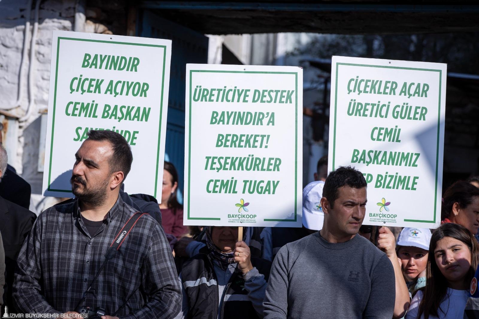 Açılış konuşmasında Bayındır'ın Türkiye'nin çiçek başkenti olduğunu vurgulayan Başkan Cemil Tugay, üreticilerin ellerindeki dövizleri işaret etti. "Çiçeğin başkenti Bayındır, üreticinin dostu Cemil Başkan", "Çiçekler açar, üretici güler. Cemil Başkanımız hep bizimle", "Bayındır çiçek açıyor, Cemil Başkan sayesinde büyüyor" ve "Üreticiye destek, Bayındır'a bereket. Teşekkürler Cemil Tugay" yazılı dövizlerin kendisini duygulandırdığını dile getiren Başkan Tugay, "Sizler üretmeye devam ettikçe bizler her anlamda yanınızda olacağız. Genel olarak Küçük Menderes, her türlü tarımsal üretim ve hayvancılıkta Türkiye'nin en önemli bölgelerinden biri. Bizim de üzerimize düşen görev, bu bölgedeki üretimi daha fazla artırmak, insanlarımızın daha fazla kazanması için elimizden gelen her türlü desteği vermek. Bunu mutlaka yapacağız. Her sene daha fazla destek vererek yola devam edeceğiz" diye konuştu.