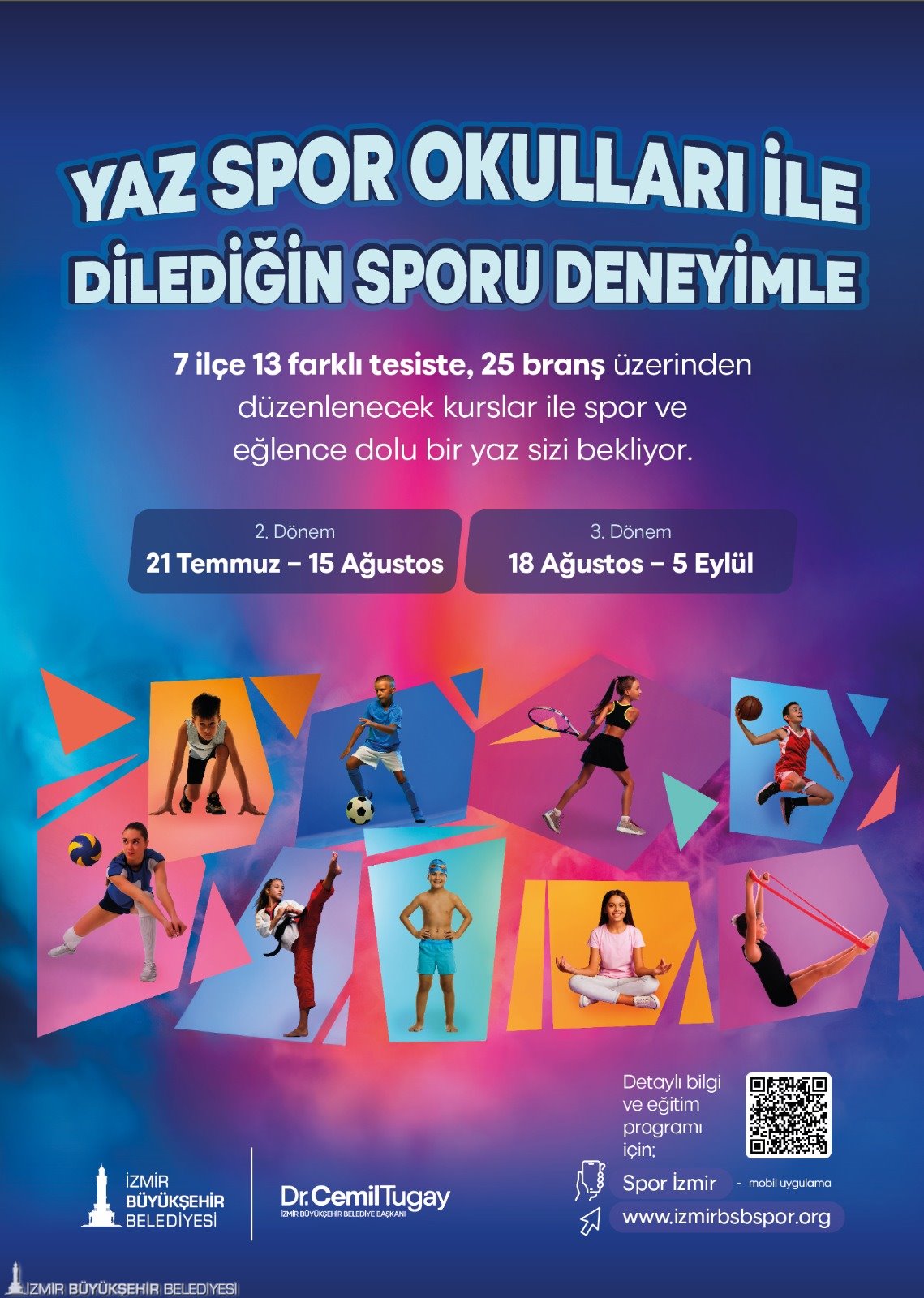 İzmir Büyükşehir Belediyesi Gençlik ve Spor Hizmetleri Dairesi Başkanlığı ile İzmir Büyükşehir Belediyesi Spor Kulübü iş birliğinde düzenlenen Yaz Spor Okulları; atletizm, badminton, basketbol, jimnastik, dans, futbol, futsal, güreş, halk oyunları, judo, kano, karate, kondisyon, masa tenisi, pilates, sağlıklı yaşam, satranç, step-aerobik, sutopu, tekvando, temel hareket eğitimi, tenis, voleybol, yoga, yüzme olmak üzere 25 branşta kurs düzenliyor. Ayrıca özel gereksinimli bireyler için de basketbol eğitimleri veriliyor. 7 ilçe 13 farklı tesiste devam eden kurslarda çocuk, genç ve yetişkinlerin fiziksel ve sosyal gelişimlerinin desteklenmesi hedefleniyor. 100’ü aşkın uzman antrenör ve spor eğitmeni eşliğinde gerçekleştirilen spor kurslarında yeteneğiyle öne çıkan çocuklar, İzmir Büyükşehir Belediyesi Spor Kulübü altyapı takımlarına davet ediliyor.