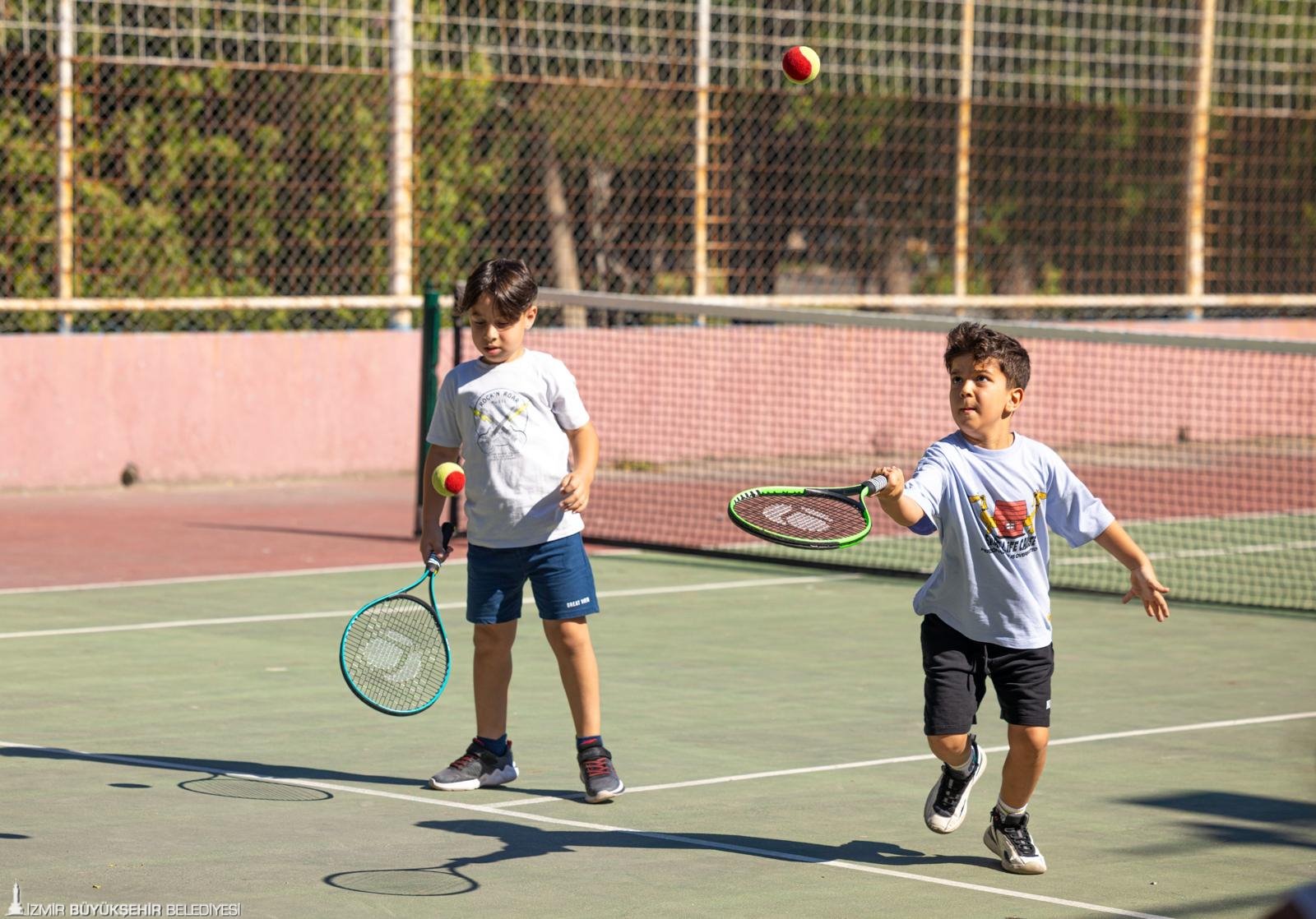 Yaz Spor Okulları kapsamında verilen tenis eğitimleri özellikle çocuklar tarafından büyük ilgi görüyor. Tenis Antrenörü Onur Kılınç, “Tenis branşında çocuklara temel tenis eğitimleri veriyoruz. Burada tenis oynayarak keyifli vakit geçiriyorlar. Küçük yaşta sporda branşlaşarak kendilerini geliştirirlerse ileride iyi bir sporcu olmak için büyük potansiyel taşıyabilirler. Bunun için spora küçük yaşta başlamak ve deneyim kazanmak çok önemli” dedi. Tenis kursuna katılan 7 yaşındaki Ege Alp Manav’ın babası Mehmet Can Manav da “Oğlum haftada iki gün tenis kursuna geliyor. Güzel bir etkinlik, çocuklar profesyonel antrenörlerle iyi bir eğitim alıyor. İzmir Büyükşehir Belediyesi iyi bir hizmet veriyor. Tesis de çok güzel. Çok memnunuz” diye konuştu.