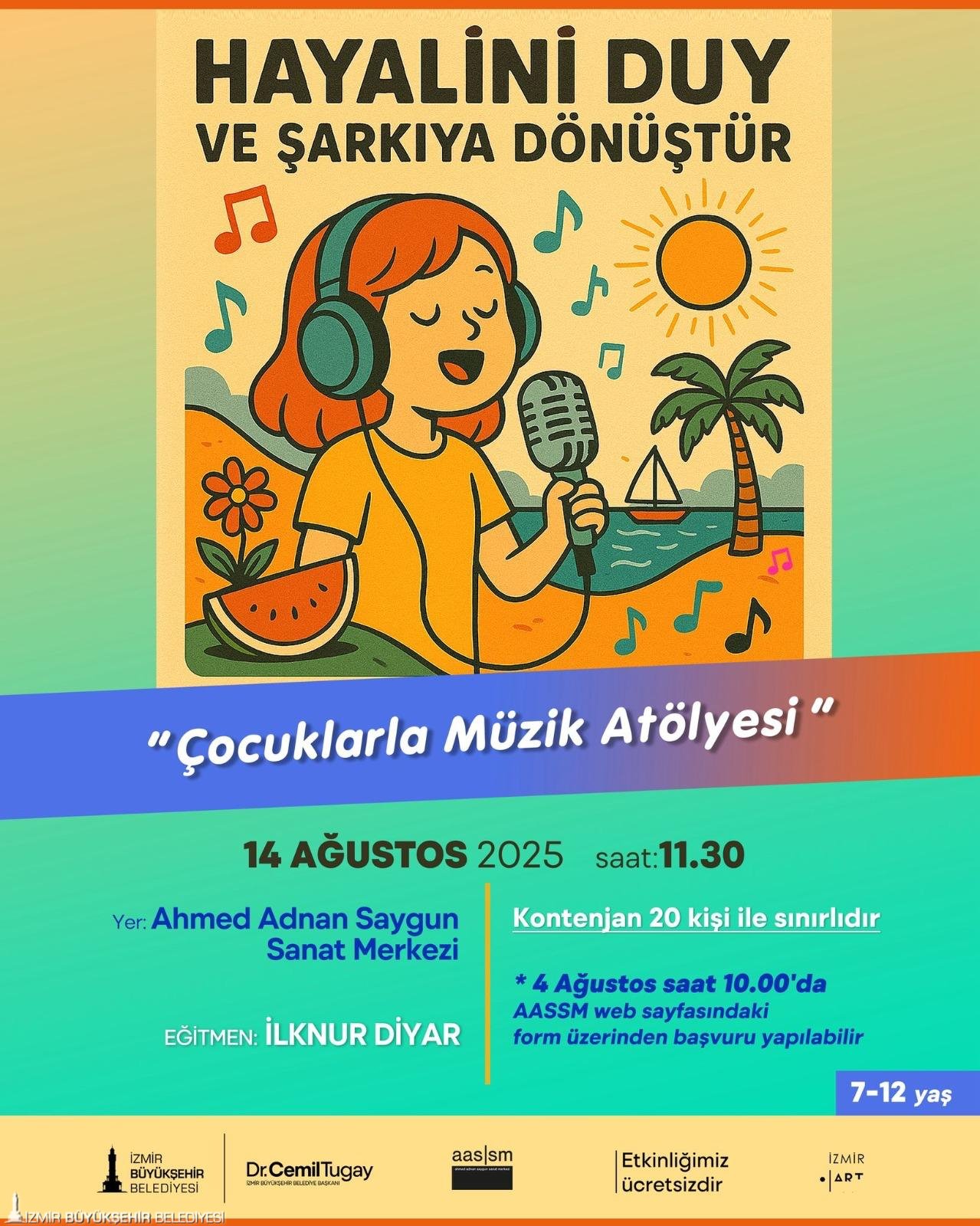 Ahmed Adnan Saygun Sanat Merkezi (AASSM), ağustos ayında da sergi ve atölye çalışmalarına ev sahipliği yapacak. 14 Ağustos’ta Hayalini Duy ve Şarkıya Dönüştür-Çocuklarla Müzik Atölyesi” gerçekleştirilecek. “Sevginin Gücü” adlı sulu boya resim sergisi, 6-31 Ağustos tarihleri arasında üst kat batı galeri bölümünde, ‘‘Denize Dair’’ ve ‘‘Diyalektik’’ resim sergiler ise 8-31 Ağustos tarihleri arasında alt kat galeri bölümünde ziyaret edilebilecek. Camda Antik Ege Koleksiyon Sergisi de 20 Ağustos-15 Eylül tarihleri arasında giriş kat doğu ve batı galeride yer alacak.