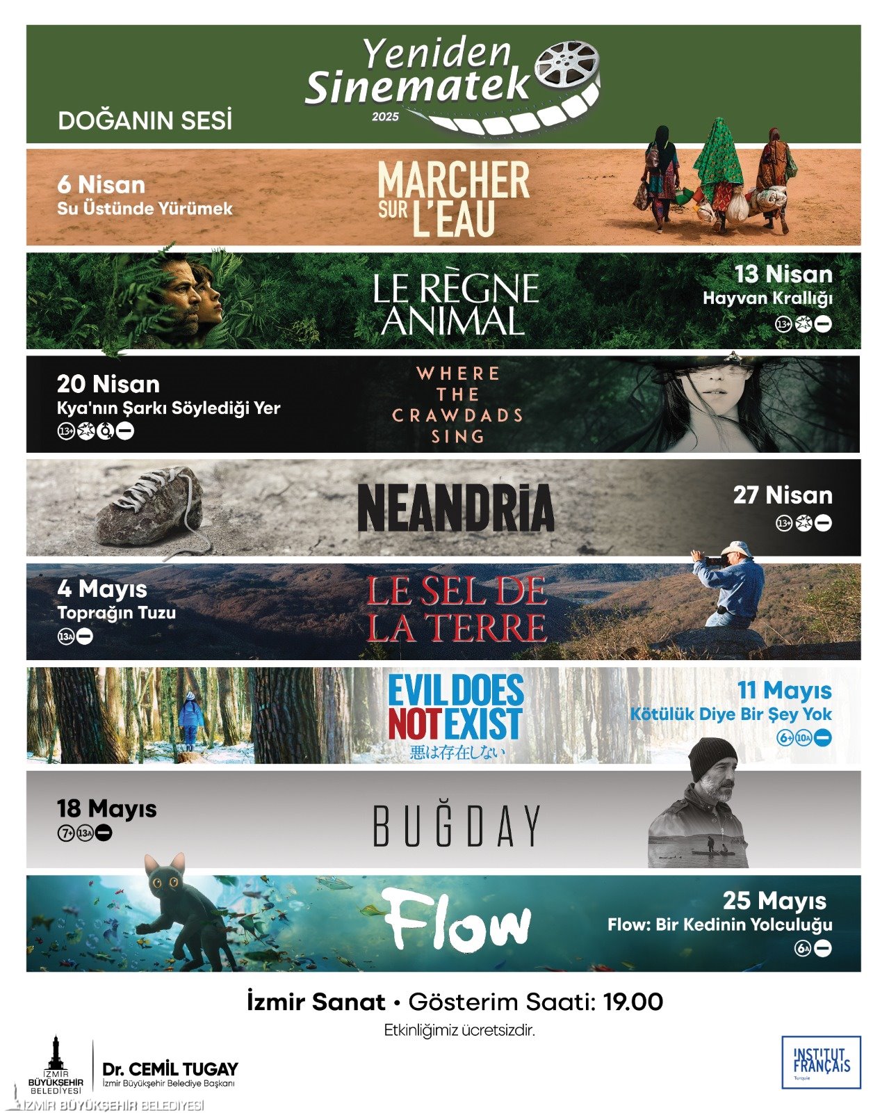 Film gösterimleri kapsamında 13 Nisan’da Hayvan Krallığı, 20 Nisan’da Kya'nın Şarkı Söylediği Yer ve 27 Nisan’da Neandria var. Mayıs ayı gösterimleri ise 4 Mayıs’ta Toprağın Tuzu filmi ile başlayacak. 11 Mayıs’ta Kötülük Diye Bir Şey Yok, 18 Mayıs’ta Buğday ve 25 Mayıs’ta Flow: Bir Kedinin Yolculuğu filmleri sinemaseverlerle buluşacak. Tüm filmler İzmir Sanat Büyük Salon’da saat 19.00’da ücretsiz olarak gösterilecek.