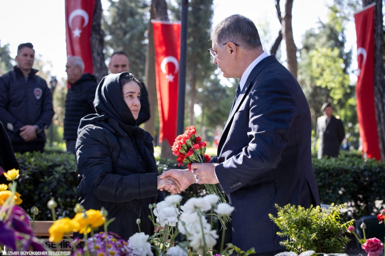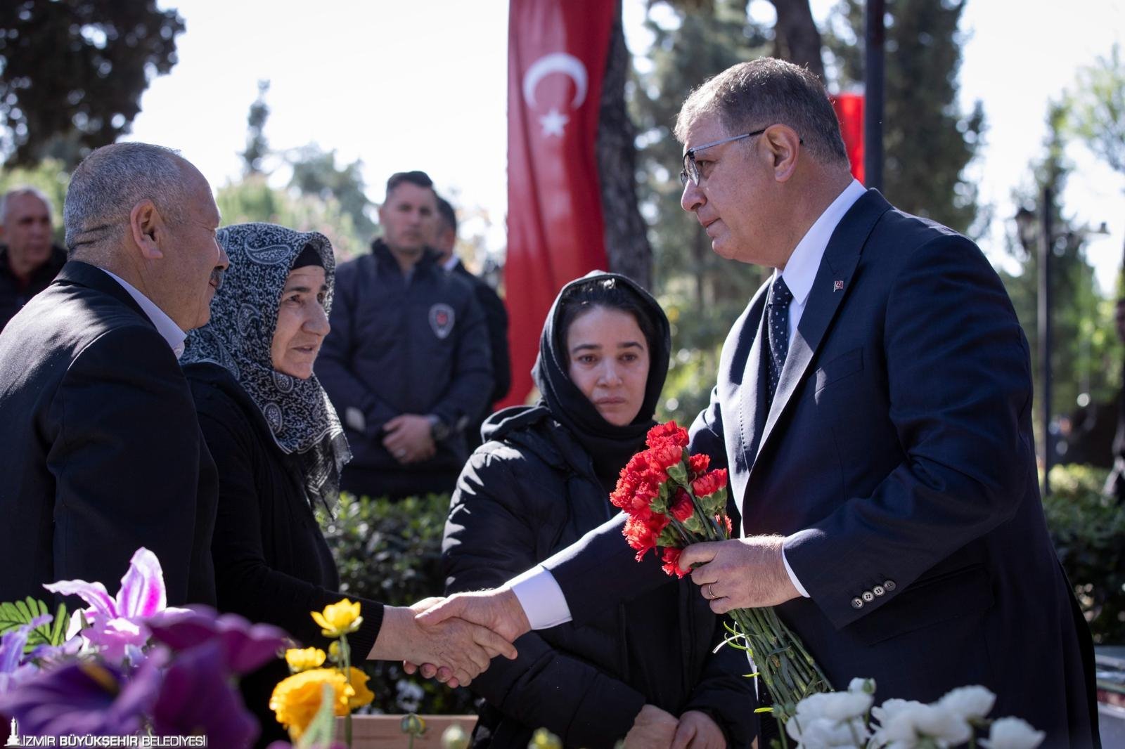 Following prayers, attendees visited the graves, leaving flowers. Mayor Tugay placed carnations on the martyrs’ graves, offered prayers, and met with veterans and families of the fallen.