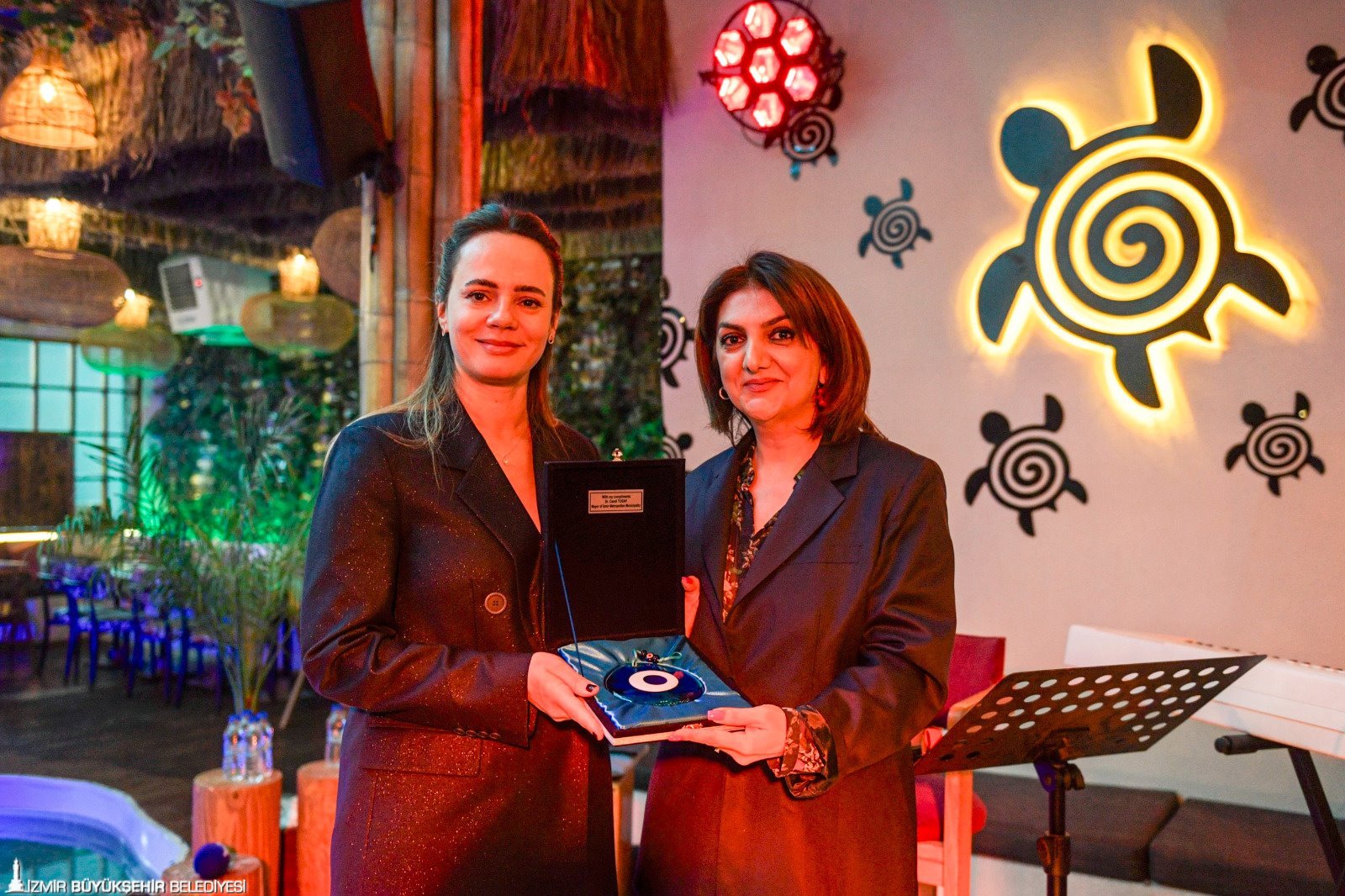 Öznur Tugay, spouse of the Mayor of İzmir Metropolitan Municipality, Dr. Cemil Tugay, attended the March 8 International Women’s Day event organized by İzmir Azerbaijan Association (İZAZDER). The event was hosted by Terlan Akçay, President of İZAZDER Women’s Committee. Tugay said, “It is very meaningful to be together on this special day. I hope that women will not be torn away from life, will not suffer psychological or physical violence, and that Women’s Day will become a day celebrated only with joy. Let’s achieve this change together through unity and strength.” Akçay congratulated all women on Women’s Day and presented Öznur Tugay with a traditional Azerbaijani shawl, while Tugay gifted Akçay an evil eye amulet.