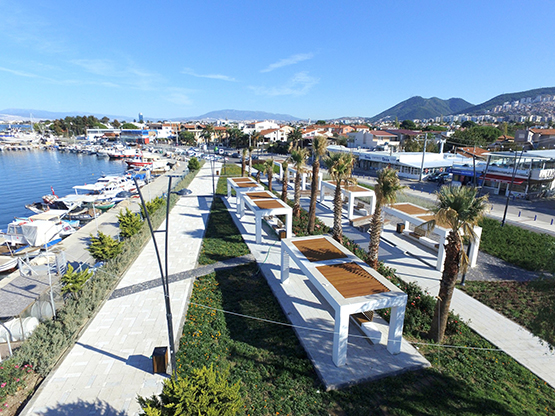 İzmir Büyükşehir Belediyesi, Bostanlı sahiline kurulan ve başta gençler olmak üzere, İzmir’in eşsiz körfez manzarası eşliğinde günün yorgunluğunu atmak isteyenlerin büyük beğenisini kazanan ahşap görünümlü gün batımı terasından birini de Narlıdere-Sahilevleri Projesi için kurdu. Kıyı bandına dağıtılan oturma bankları ise doğal taş ve beton prekasttan yapıldı. Denize daha da yakınlaşmak isteyenler için ayrıca 4 adet balıkçı iskelesi oluşturuldu.