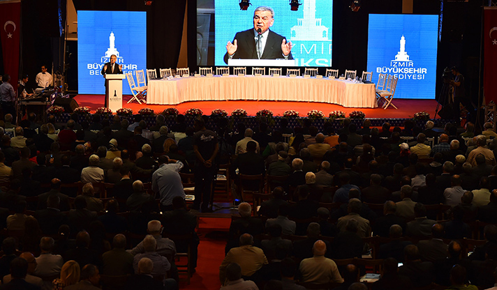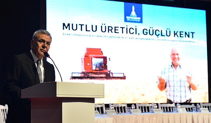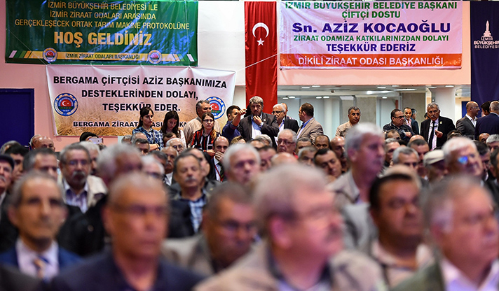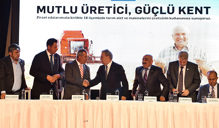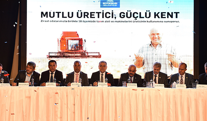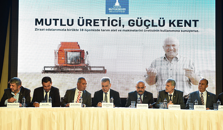 Yerelde kalkınma hedefiyle Türkiye’ye örnek uygulamaları hayata geçiren İzmir Büyükşehir Belediyesi, üretici desteklerine bir yenisini daha ekledi. Aliağa, Bayındır, Bergama, Beydağ, Dikili, Foça, Karaburun, Kemalpaşa, Kınık, Kiraz, Menderes, Menemen, Ödemiş, Seferihisar, Selçuk, Tire, Torbalı ve Urla ziraat odaları ile ortak tarım makineleri parkı oluşturulması için hazırlanan protokol imza töreninde konuşan İzmir Büyükşehir Belediye Başkanı Aziz Kocaoğlu, Belediye'nin maddi olanaklarını tüm İzmir'e dağıtırken, çok aha az gelişmiş olan tarımın kalkınması için pozitif ayrımcılık yaptıklarını belirterek, "En az hizmeti neresi aldıysa, en az hangi bölgenin elinden tutulduysa ona ağırlık vermek, onun önünü açmak, onun problemlerini çözmek üzere bir adil yönetim anlayışı sergiliyoruz. Baktık en mağdur olan çiftçi; o zaman 'kırsaldan başlayalım' dedik ve öyle yaptık. Belli oranda başarılı olduk. Ama daha yolun başındayız. Daha yapacak çok işimiz var" dedi.