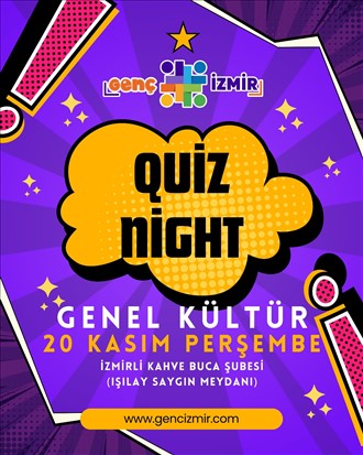 Türkiye Sağlıklı Kentler Birliği Başkanı ve İzmir Büyükşehir Belediye Başkanı Dr. Cemil Tugay'ın "genç dostu kent" vizyonu doğrultusunda çalışmalarını sürdüren Kadın ve Aile Hizmetleri Dairesi Başkanlığı'na bağlı Gençlik Çalışmaları Şube Müdürlüğü bünyesindeki Genç İzmir, eğlendiren ve geliştiren etkinliklerine yenilerini ekliyor. Üniversiteye hazırlık ve yabancı dil kursları, konservatuvara hazırlık eğitimi, kültür turları, atölyeler ve gençlik kampları gibi ücretsiz uygulamalarla gençlerin konforunu arttıran Genç İzmir, quiz gecesi serisini "genel kültür" temasıyla başlatıyor.