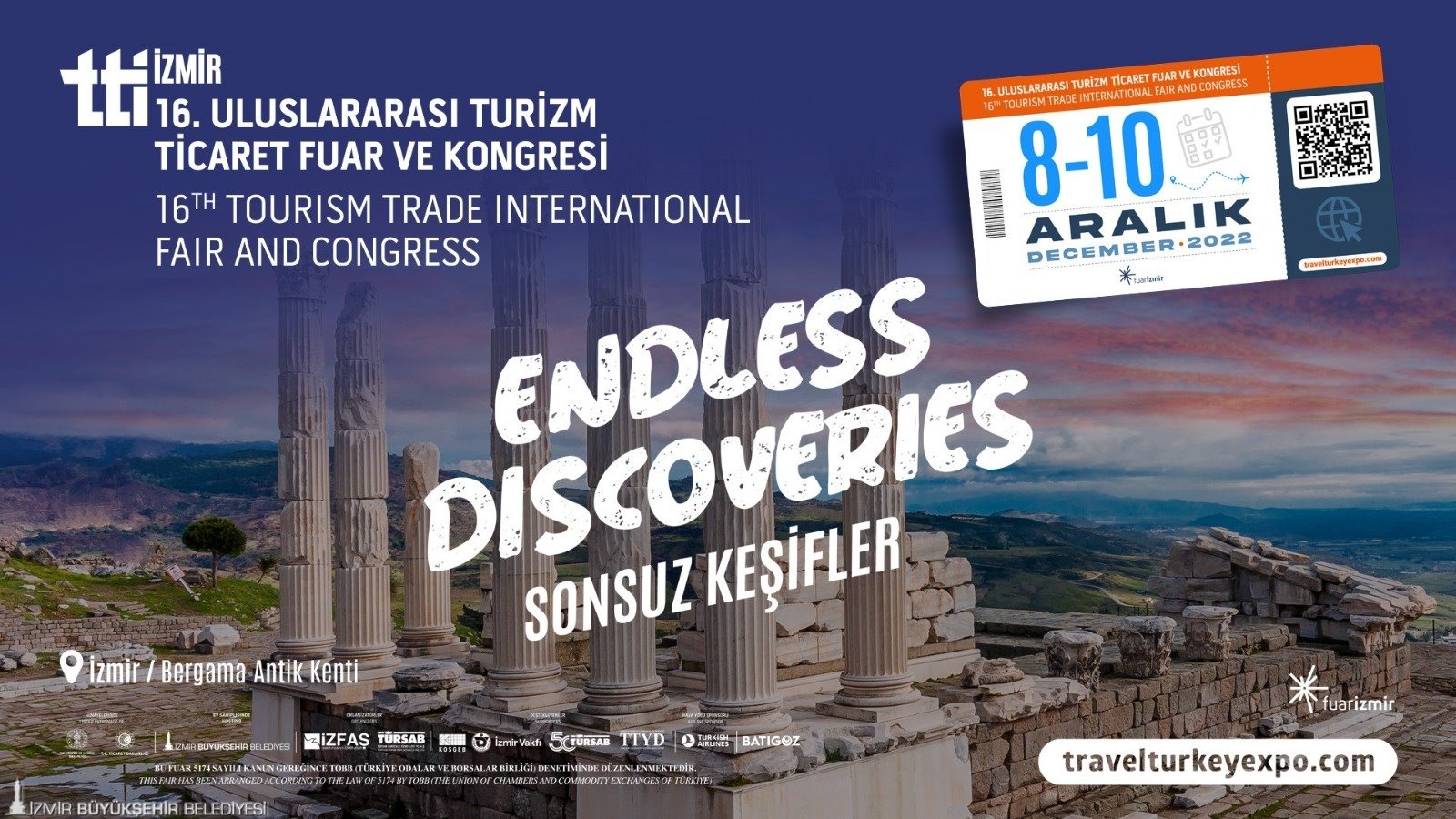 Kültür ve Turizm Bakanlığı himayesinde, İzmir Büyükşehir Belediyesi ev sahipliğinde, TÜRSAB desteği, İZFAŞ ve TÜRSAB Fuarcılık ortaklığında düzenlenen 16. TTI İzmir Uluslararası Turizm Ticaret Fuar ve Kongresi, dünyanın dört bir yanından turizm profesyonelleri ve ziyaretçileri ağırlamaya hazırlanıyor. Bu yıl onur konuğu ilin Antalya olduğu yarın açılacak TTI İzmir, ticari ve yatırım fırsatlarının yanı sıra etkinlikleri ve “sağlık turizmi” ile “kruvaziyer turizmi” alanlarıyla da dünya turizm trendlerini Fuar İzmir’de bir araya getirecek. İlk iki gün profesyonel ziyaretçilerini ağırlayacak fuar, son gün halka açık olacak. TTI İzmir’in tecrübesini arkasına alarak doğaseverlerin ihtiyaçlarına cevap vermek amacıyla geçen yıl ilk kez düzenlenen TTI Outdoor Kamp, Karavan, Tekne, Outdoor ve Ekipmanları Fuarı ise dört gün boyunca halkın ziyaretine açık olacak.