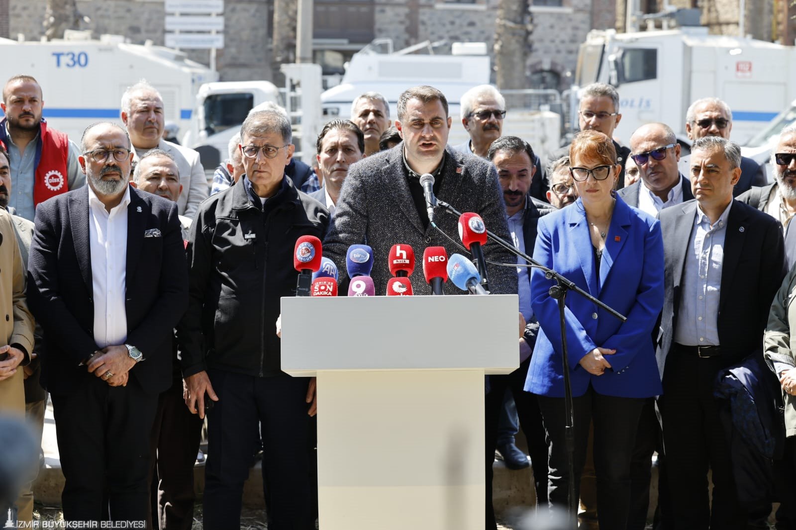 “İçeride belediyeye ait yüz milyonlarca liralık kamu malına el konuldu. Çalışanlarımızın kişisel eşyalarını almalarına izin verilmedi. Üstelik bu bina tescilli bir kültür binasıdır ve dün zarar gördü. Vakıflar, binaları korumak için böyle uygulamalar yapıyor iddiasında bulunuyor, ama uygulanan yöntemle bina zarar gördü. Kapılar tokmakla zorlanarak kırıldı ve değiştirildi. Yetkisi olmayan özel güvenlik girişleri engelledi. Hukuki tespit yapılması bile engellendi. Tespitler sırasında kameraların çalışmaması için binanın elektriği kesildi. Vakıflar’ın özel güvenlik görevlilerinden biri, Atatürk imzalı tapu belgesi pankartını, tahliyeye tepki gösteren vatandaşları tahrik etmek amacıyla keserek aşağı atmış. Açık ve nettir ki, ortada mülkiyeti tartışmalı bir yapı, devam eden bir dava ve beklenen bir yargı süreci var. Tüm bunlar varken, sabahın erken saatlerinde polis ablukasıyla yapılan bu işlemi ‘hukuk çerçevesinde’ yapılan bir işlem olarak tanımlayamayız. İzmir, hukuk şehridir ve bu şehir, oldu bittilere teslim edilemez.”