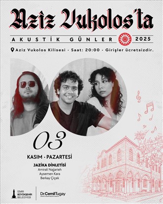 İzmir Büyükşehir Belediyesi Kültür, Sanat ve Sosyal İşler Dairesi Başkanlığı tarafından, kent kültürüne katkı sağlamak ve müzikal çeşitliliği desteklemek amacıyla “Aziz Vukolos’ta Akustik Günler” konser etkinliği düzenlenecek. Etkinlik programında, farklı müzik türlerini bir araya getiren zengin bir repertuvar yer alıyor. Müzik etkinlikleriyle hem yerel hem de evrensel müzik türlerinin bir arada sunulması, kentin kültürel çeşitliliğinin vurgulanması ve sanatseverlerin farklı müzik tarzlarını deneyimleyebilmesi amaçlanıyor.