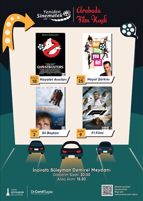 İzmirli sinemaseverlerin büyük ilgi gösterdiği Yeniden Sinematek Arabada Film Keyfi etkinliği kapsamında gerçekleşecek film gösterimleri, 18 Eylül-9 Ekim tarihleri arasında seyircisiyle buluşmaya hazırlanıyor. Dram, komedi, bilim kurgu ve müzik türlerinde dört filmin gösterileceği programda, farklı hikâyelere doğru yolculuğa çıkan izleyicilere aynı zamanda nostaljik bir film izleme deneyimi yaşatılacak. Hayalet Avcıları/Ghostbusters 18 Eylül, Hayal Şarkısı/That Thing You Do! 25 Eylül, Sil Baştan/Eternal Sunshine of the Spotless Mind 2 Ekim, F1 Filmi/F1: The Movie ise 9 Ekim günü saat 20.00’de İnciraltı Süleyman Demirel Meydanı’nda izleyici ile buluşacak. Araçların alana alımı ise saat 18.30’da gerçekleşecek.