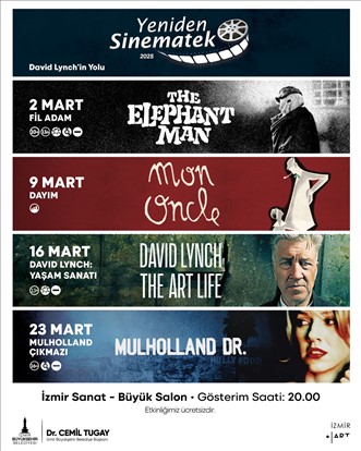 Film gösterimleri 2 Mart Pazar günü The Elephant Man (Fil Adam) ile İzmir Sanat Büyük Salon’da başlayacak. 9 Mart Pazar günü Mon Oncle (Dayım), 16 Mart Pazar günü David Lynch: The Art Life (David Lynch: Yaşam Sanatı) ve 23 Mart Pazar günü ise Mulholland Dr. (Mulholland Çıkmazı) İzmir Sanat Büyük Salon'da saat 20.00'de gösterilecek