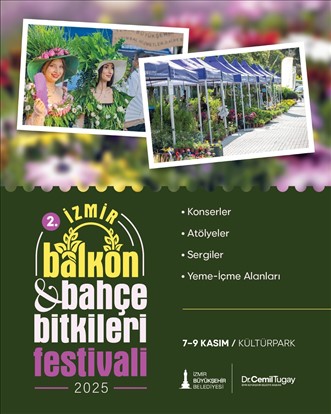 İzmir Büyükşehir Belediyesi 7-9 Kasım tarihlerinde Kültürpark’ta 2. Balkon ve Bahçe Bitkileri Festivali’ni düzenliyor. Festivalin açılışı İzmir Büyükşehir Belediye Başkanı Dr. Cemil Tugay’ın katılımıyla 7 Kasım’da saat 17.30’da yapılacak.