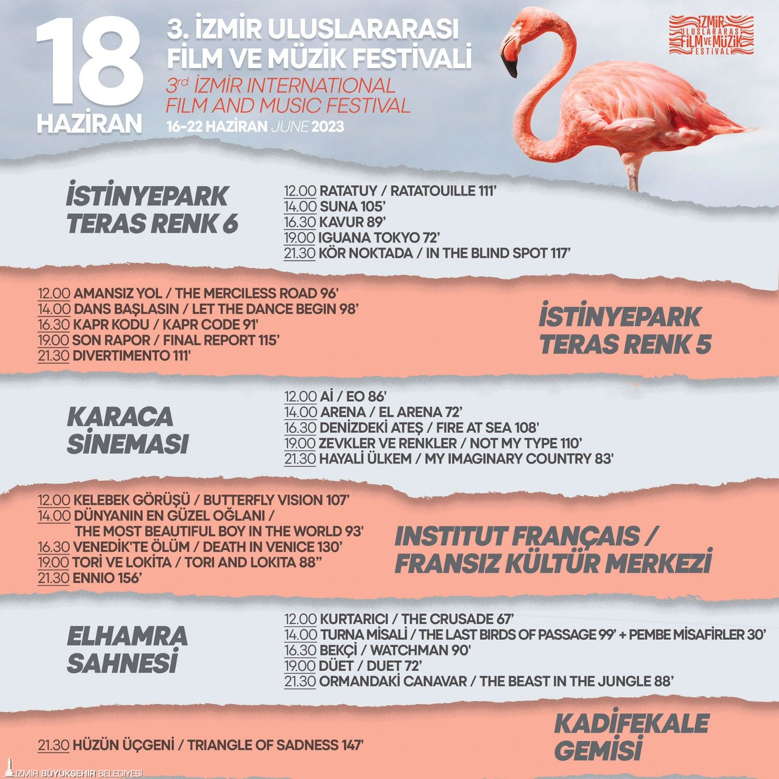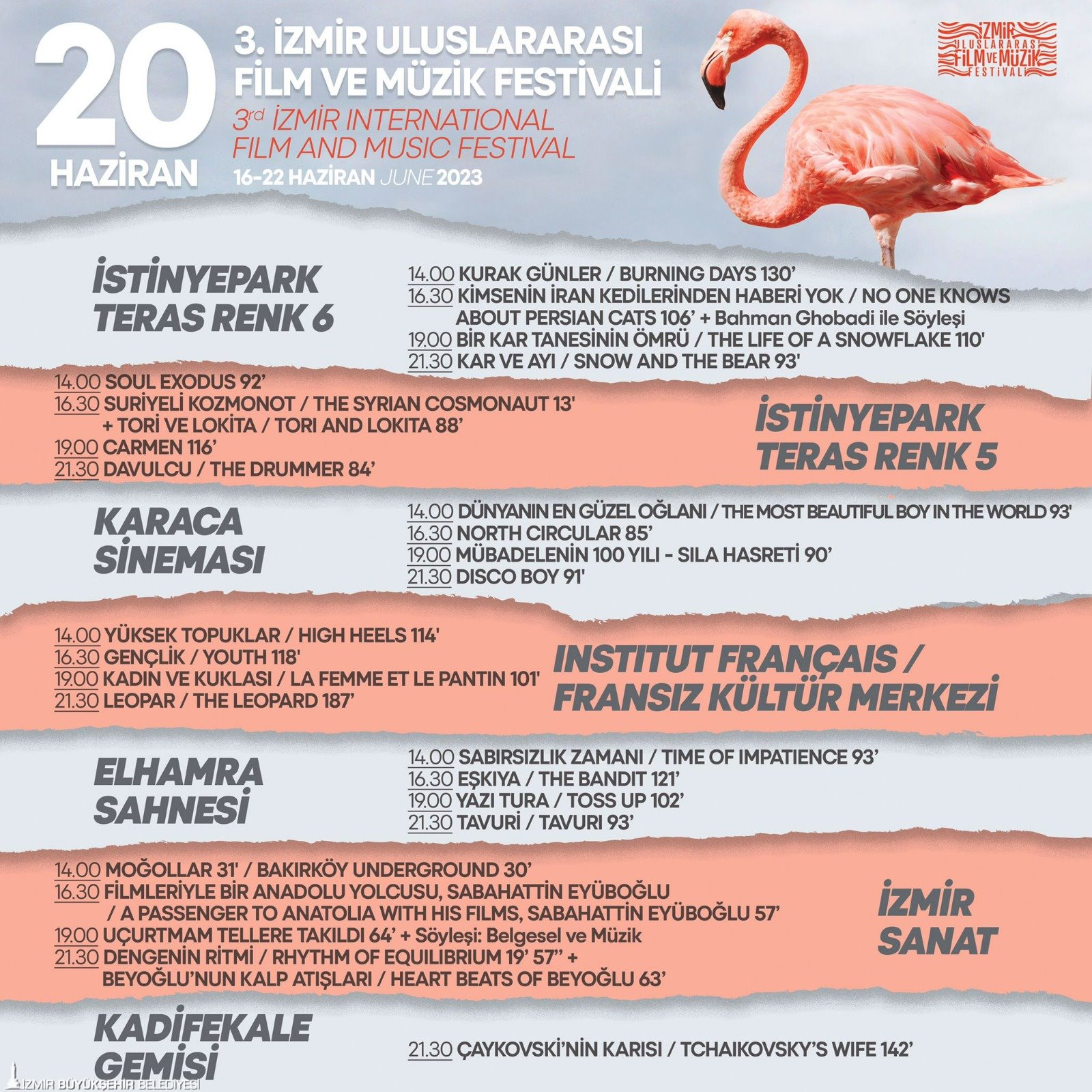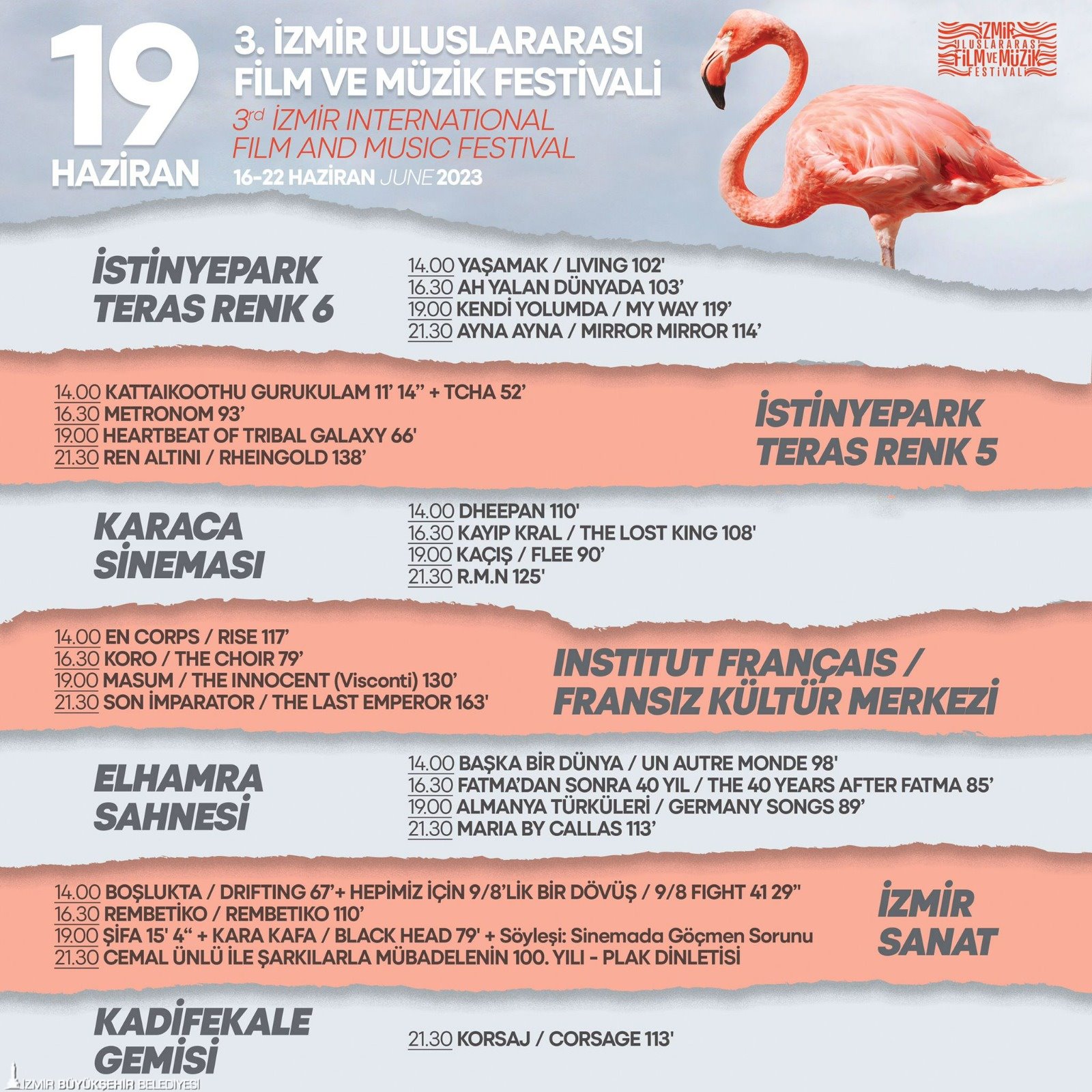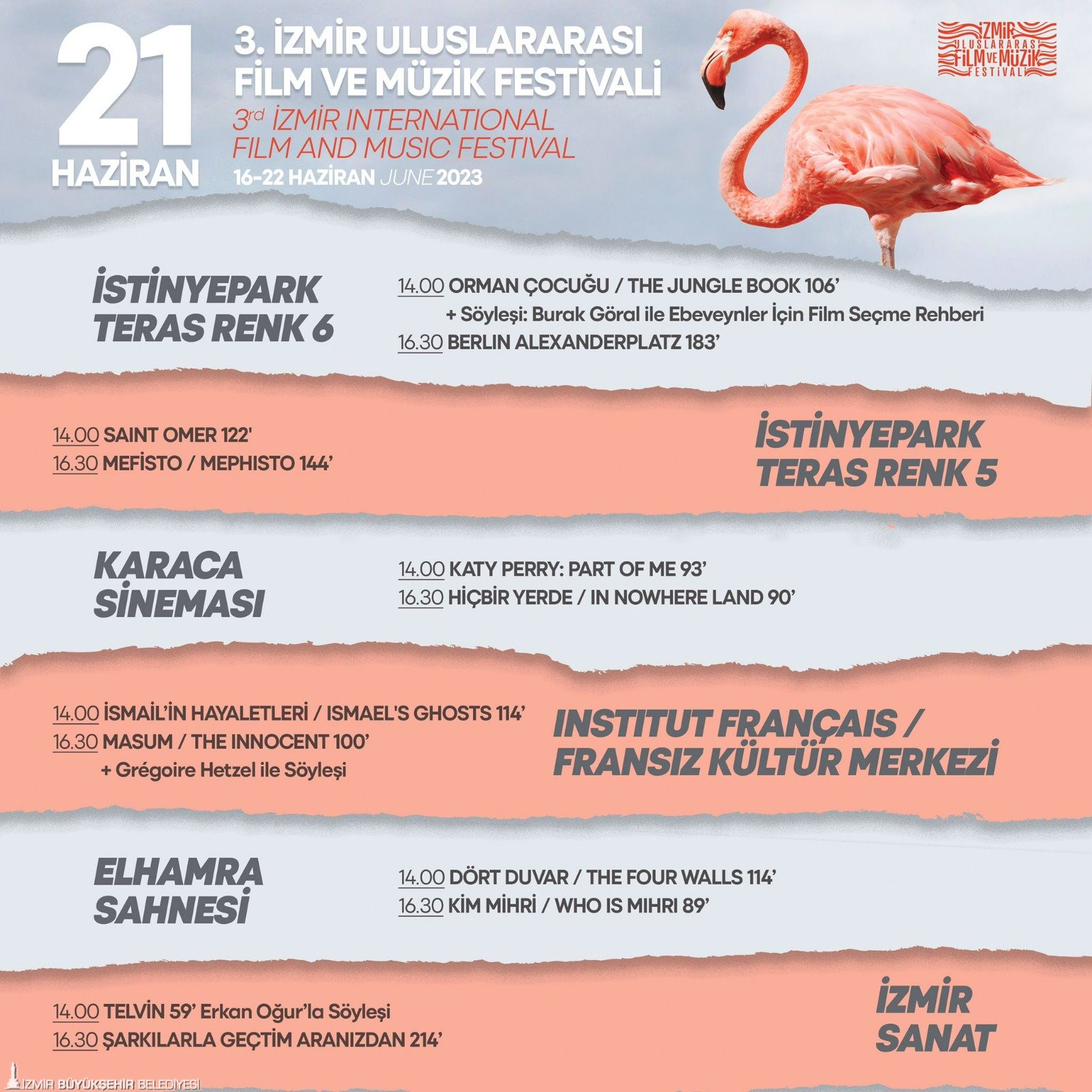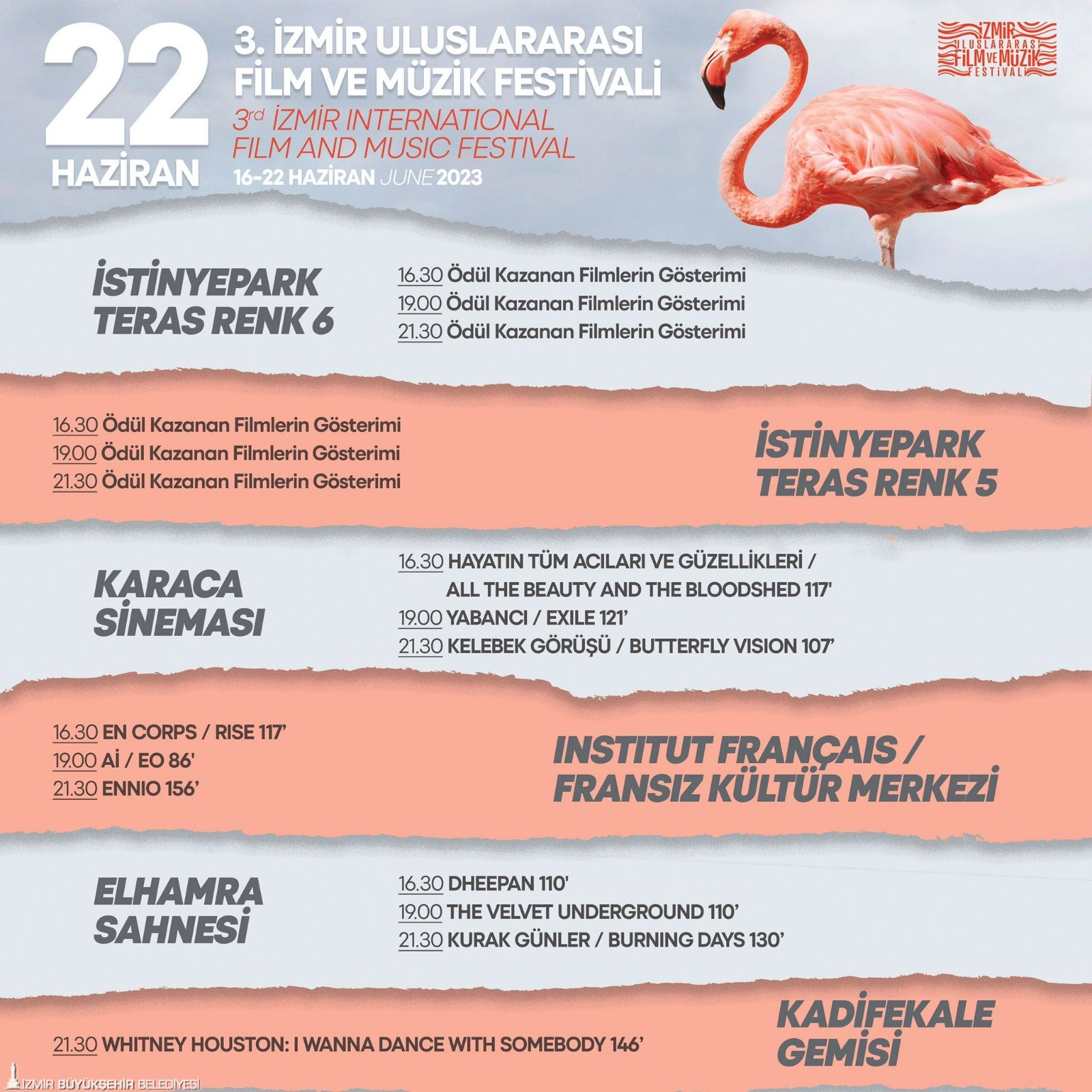 22 Haziran’a kadar devam edecek 3. İzmir Uluslararası Film ve Müzik Festivali’nde 7 farklı lokasyonda düzenlenen ücretsiz film gösterimleri İstinyePark Teras Renk Sinemaları, Elhamra Sahnesi, Karaca Sineması, İzmir Fransız Kültür Merkezi, İzmir Sanat ve açık hava film gösterimlerinin yapılacağı Göztepe vapur iskelesindeki Kadifekale Gemisi’nde devam ediyor. Ayrıntılı bilgiye festivalin sosyal medya hesaplarından (Instagram ve facebook’ta izmirfilmmusicfest / twitter’da @izmirfilmmusic), kultursanat.izmir.bel.tr, izmirart ve https://www.ifmfest.com adreslerinden ulaşılabilir.