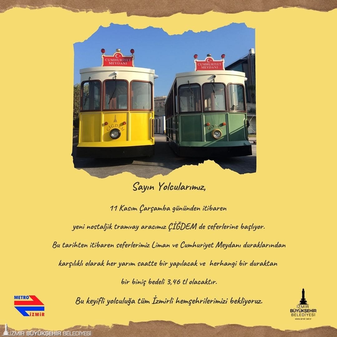 İzmir Büyükşehir Belediyesi “Boyoz” adını verdiği nostaljik tramvayın ardından “Çiğdem” adlı ikinci aracı da hizmete aldı. Lastik tekerlekli araçlara İzmirim Kart ile binilebiliyor. Biniş ücreti, mevcut tam tarife üzerinden 3,46 TL olarak belirlendi.