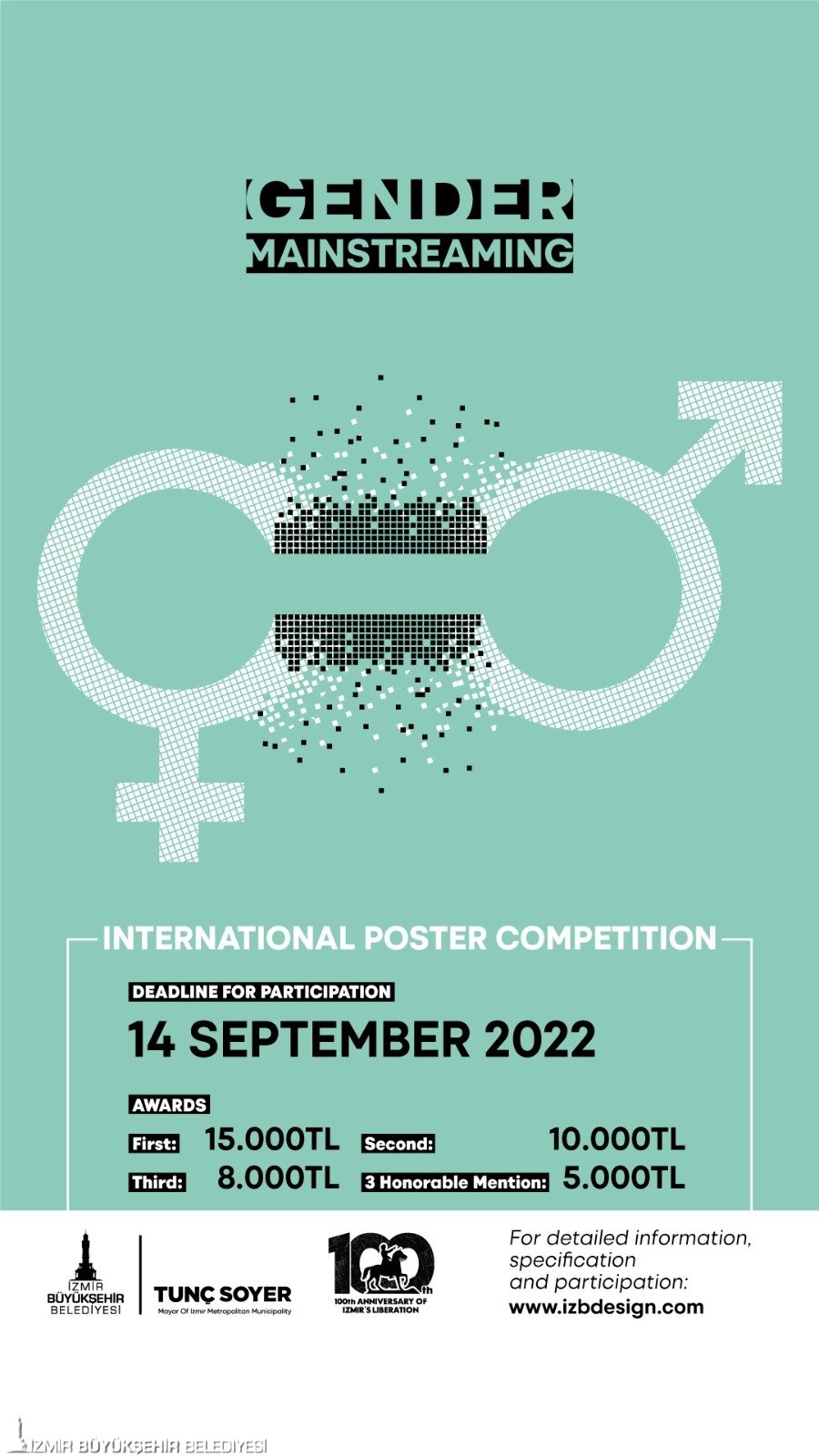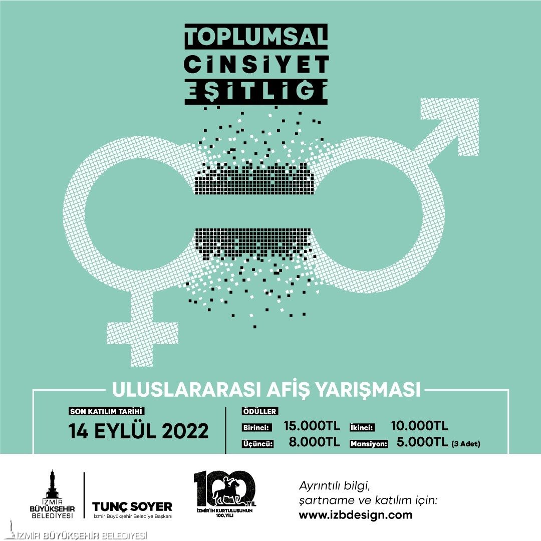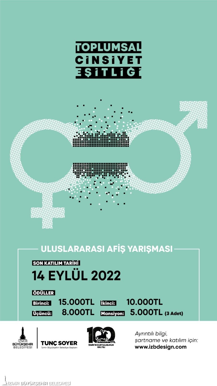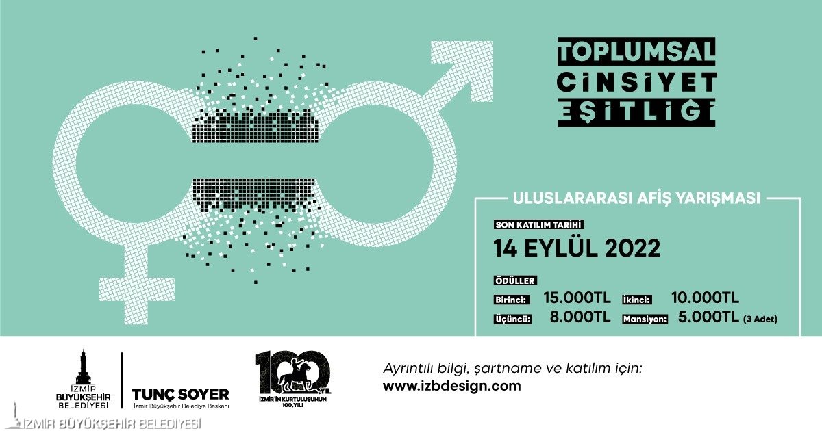 İzmir Büyükşehir Belediyesi 8 Mart Dünya Kadınlar Günü yaklaşırken “Hayatın Her Alanında Kadınlarla Eşit ve Adil Bir Dünya” sloganıyla kadın erkek eşitliğine dair farkındalık yaratmak üzere uluslararası afiş yarışması düzenliyor. “Toplumsal Cinsiyet Eşitliği” temasıyla düzenlenen yarışmaya 18 yaşını doldurmuş tüm amatör ve profesyonel tasarımcılar en fazla beş afiş ile katılabilecek. Tasarımcılar Mart ayı sonuna doğru afişlerini “www.izbdesign.com” adresine gönderebilir. 14 Eylül 2022 tarihine kadar başvuruların süreceği yarışmanın sonuçları ise 28 Eylül’de açıklanacak.
