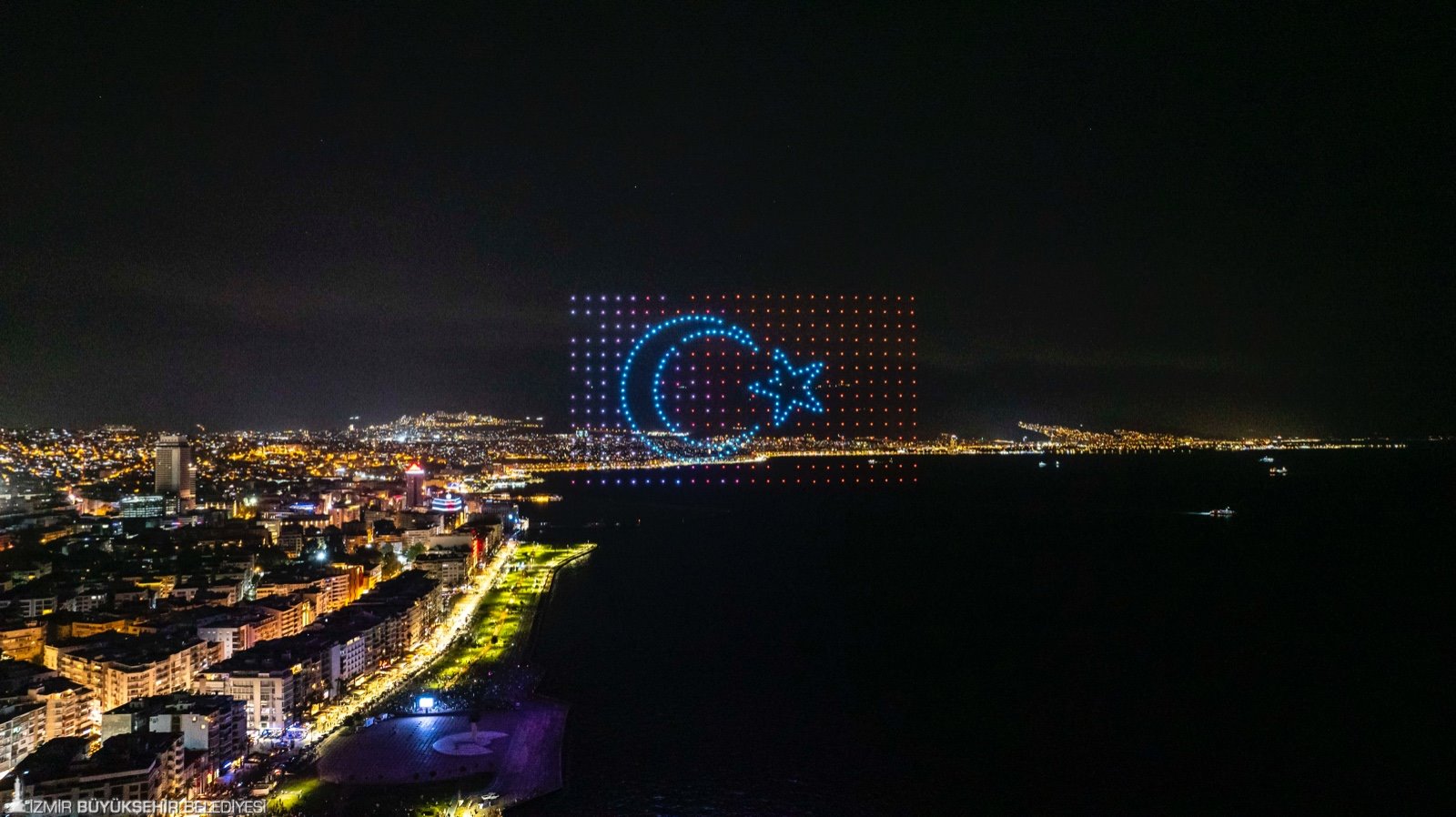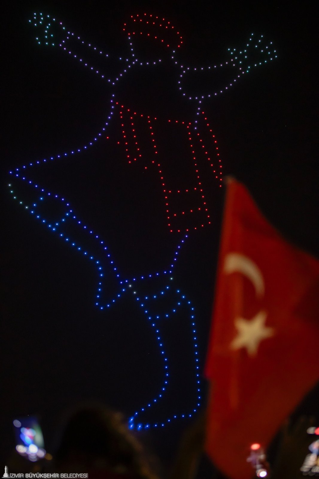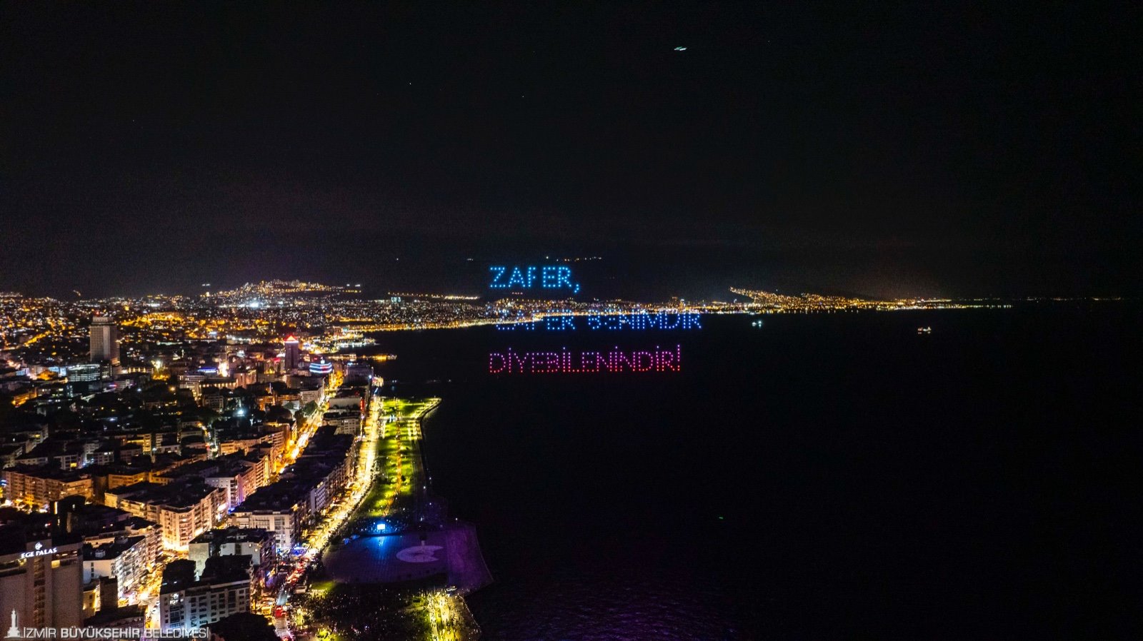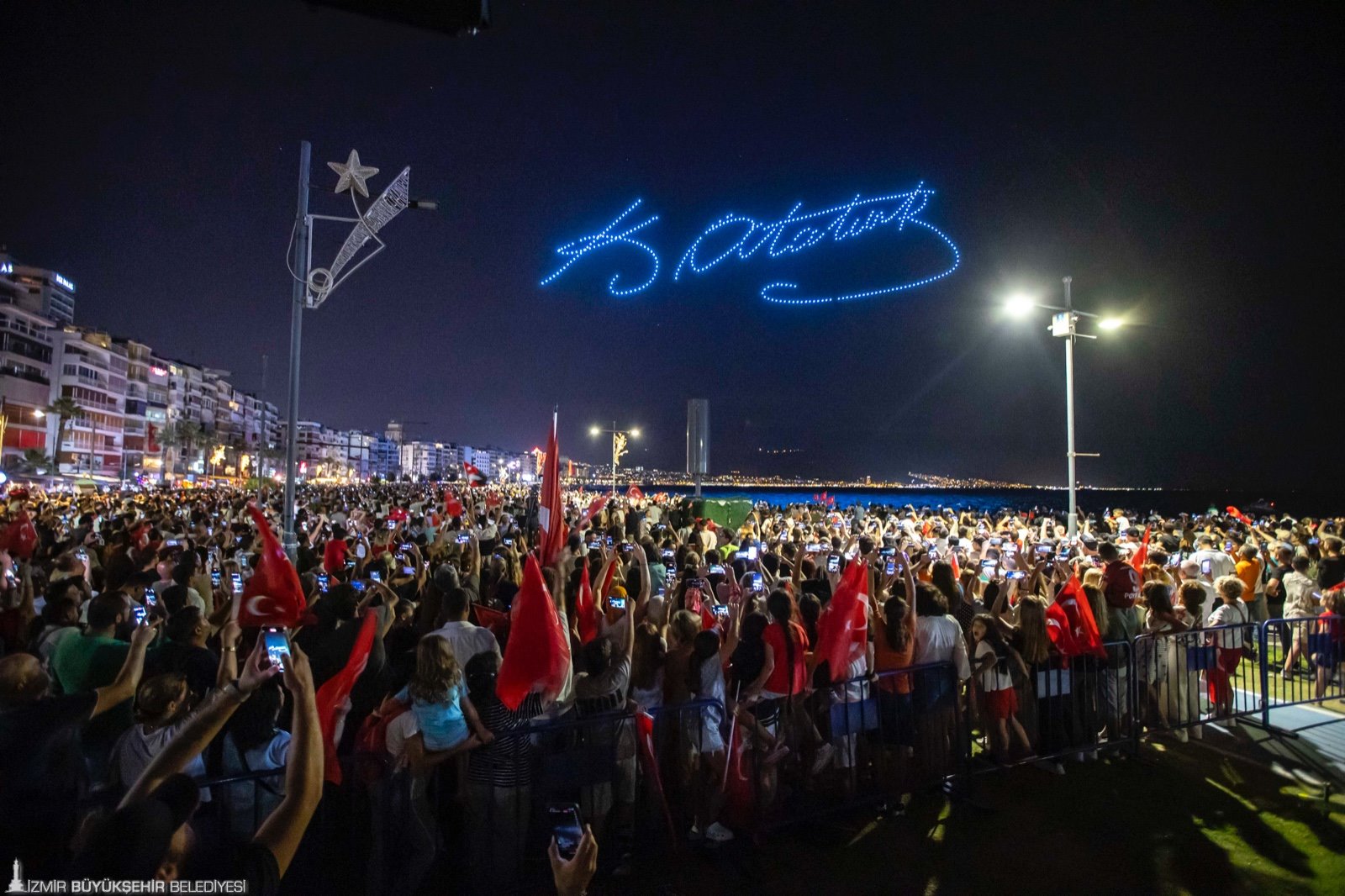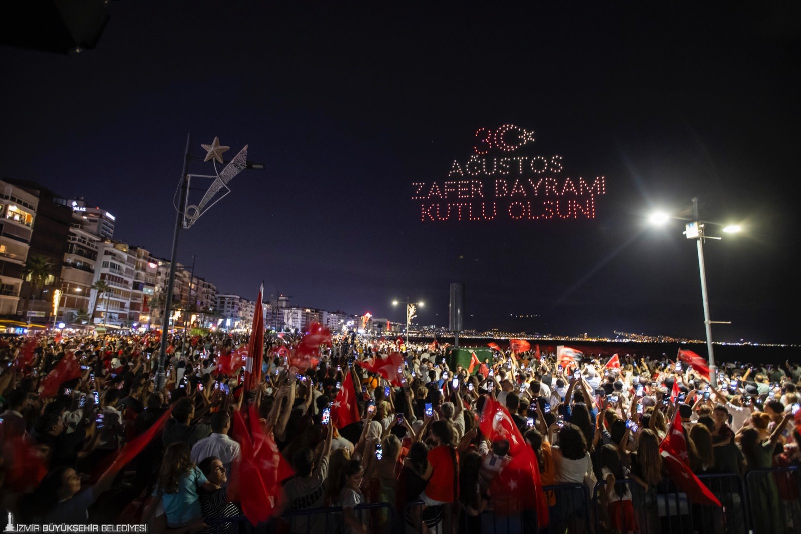 İzmir Büyükşehir Belediyesi, 30 Ağustos Zafer Bayramı kutlamaları kapsamında Gündoğdu Meydanı’nda dron gösterisi yaptı. İzmir Körfezi’nin eşsiz manzarası, 500 dronun görsel şöleni ile unutulmayacak anlara sahne oldu. İzmirli yurttaşların gösteriyi en iyi açıdan izleyebilmesi için Alsancak İskelesi’ne platform kuruldu. Çok sayıda İzmirli, ünlü oyuncu ve sunucu Yavuz Seçkin’in sunuculuğunda 30 Ağustos’u kutladı, hep bir ağızdan marşlar söyledi.
