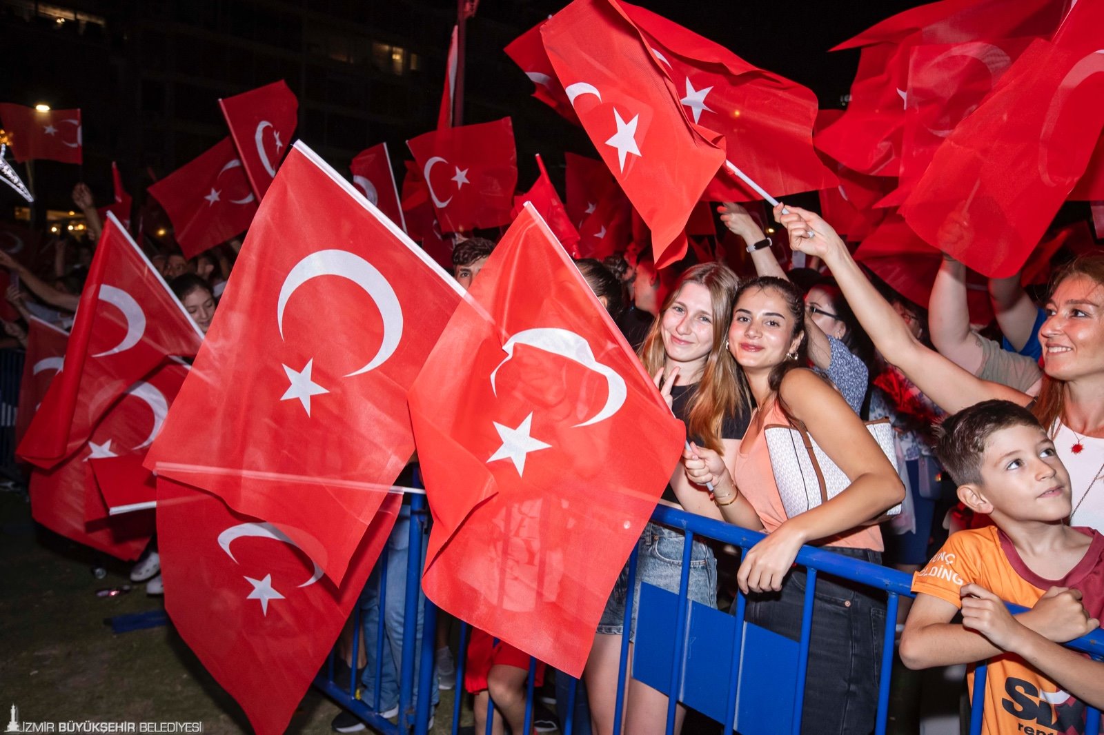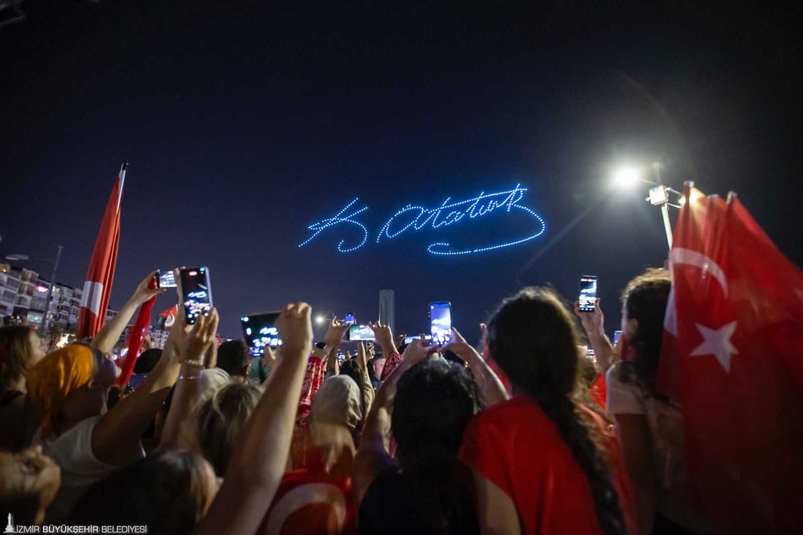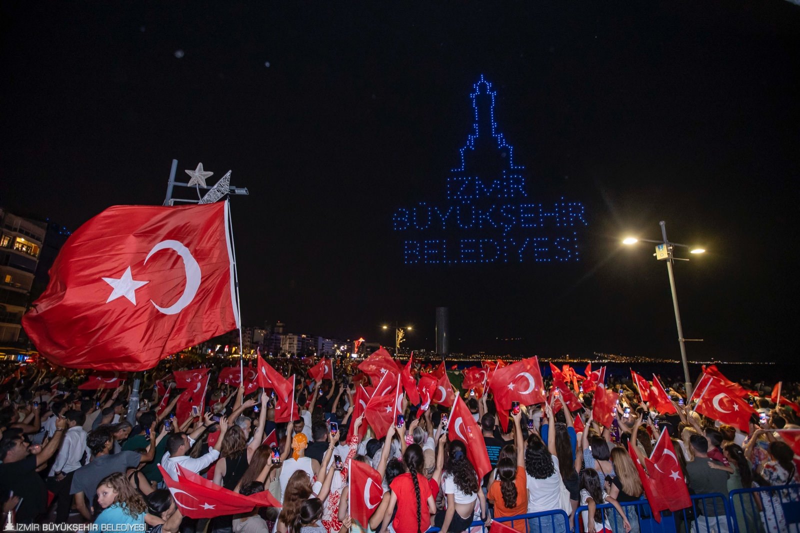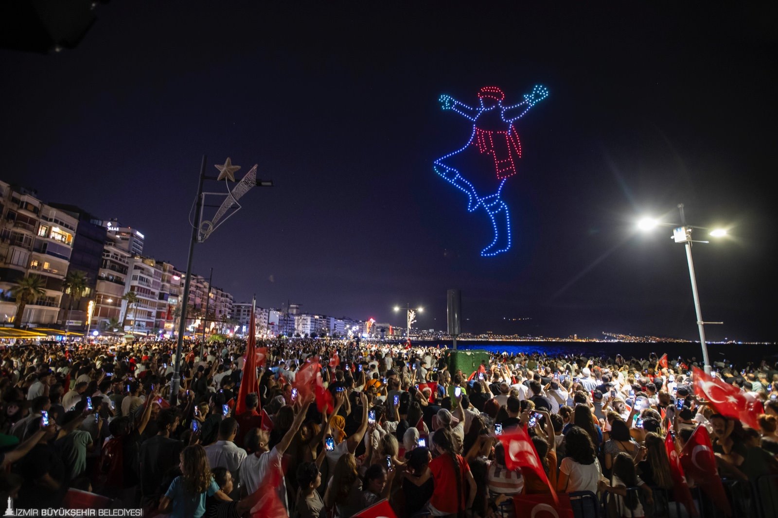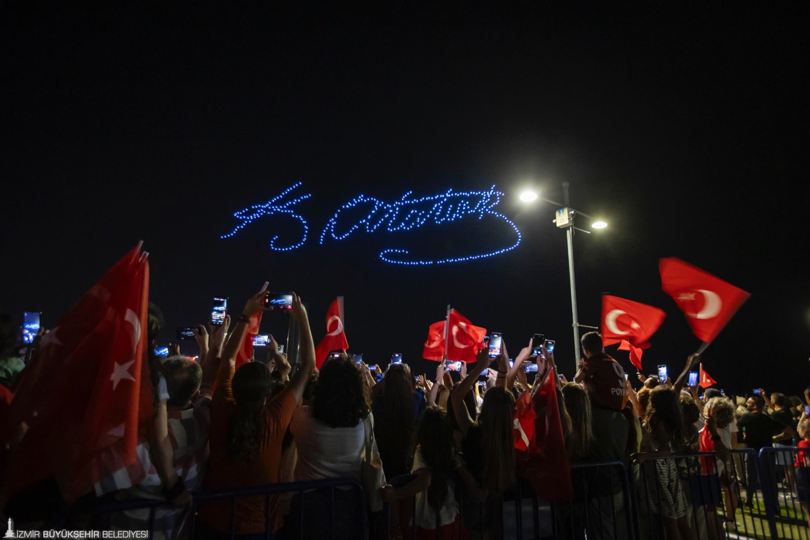 İzmir Büyükşehir Belediyesi, 30 Ağustos Zafer Bayramı kutlamaları kapsamında Gündoğdu Meydanı’nda dron gösterisi yaptı. İzmir Körfezi’nin eşsiz manzarası, 500 dronun görsel şöleni ile unutulmayacak anlara sahne oldu. İzmirli yurttaşların gösteriyi en iyi açıdan izleyebilmesi için Alsancak İskelesi’ne platform kuruldu. Çok sayıda İzmirli, ünlü oyuncu ve sunucu Yavuz Seçkin’in sunuculuğunda 30 Ağustos’u kutladı, hep bir ağızdan marşlar söyledi.