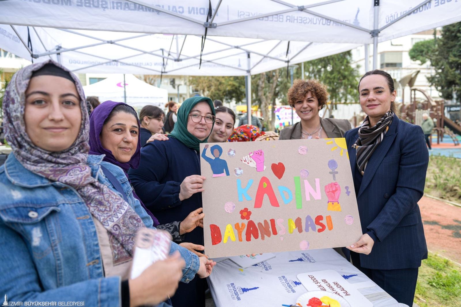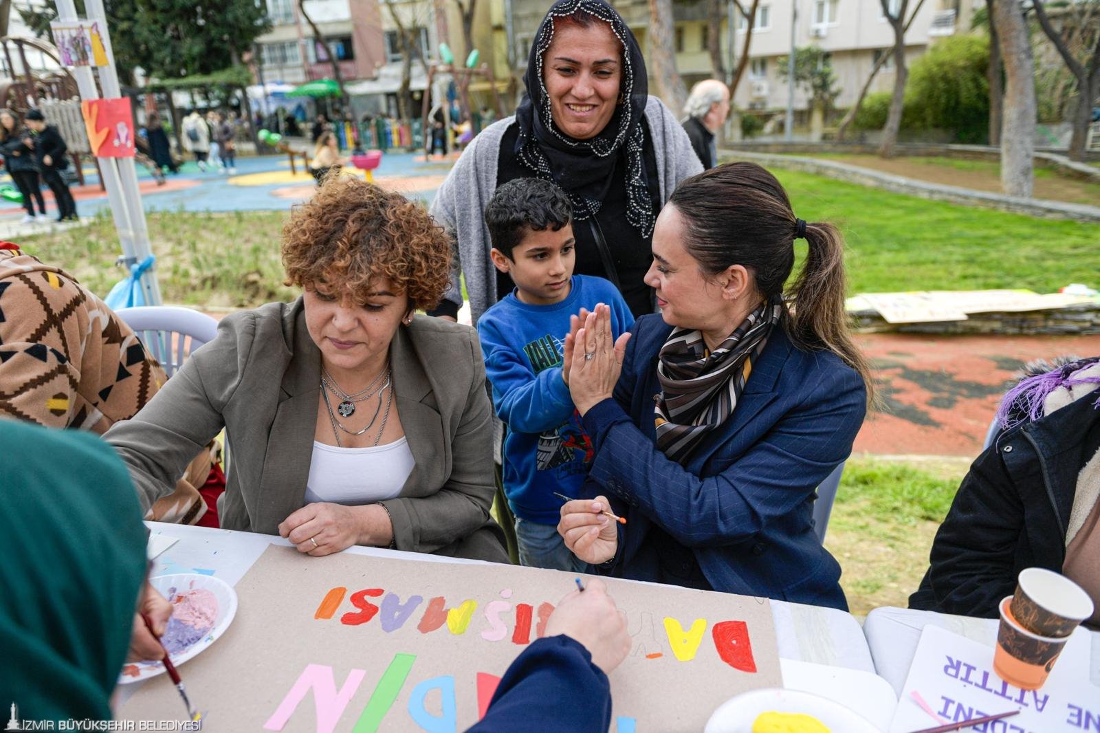İzmir Büyükşehir Belediyesi Kadın ve Aile Hizmetleri Dairesi Başkanlığı Kadın Çalışmaları Şube Müdürlüğü, 8 Mart Dünya Kadınlar Günü kapsamında “8 Mart Dayanışma Noktaları” oluşturdu. Kadınlar, Kadifekale, Agora, Hatay ve Örnekköy’de bulunan kadın dayanışma merkezlerinde sunulan hizmetleri deneyimliyor, kadın sağlığı ve toplumsal cinsiyet eşitliği gibi konularda bilgilendiriliyor, 8 Mart’a özel pankart hazırlama etkinliklerine katılıyor. Çocuklar için de oyun etkinliklerinin hazırlandığı dayanışma noktaları, dayanışmayı güçlendirerek deneyim paylaşımına imkân tanıyor. İzmir Büyükşehir Belediye Başkanı Dr. Cemil Tugay’ın eşi Öznur Tugay, Behçet Uz Parkı’nda düzenlenen dayanışma noktasında kadınlarla bir araya geldi. 8 Mart Dünya Kadınlar Günü temalı pankartlar hazırlayan Tugay, kadınlarla sohbet etti.