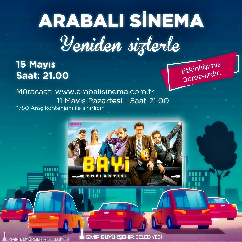 Bostanlı, İnciraltı Demokrasi Meydanı, Fuar İzmir, Bornova Aşık Veysel Rekreasyon Alanı Buz Pisti yanı, Buca ve Çiğli’de kurulacak dev perdede yönetmenliğini Bedran Güzel'in yaptığı "Bayi Toplantısı" filmi ücretsiz gösterilecek. Sinemaseverler arabalarından inmeden güvenli bir şekilde sinema keyfi yaşayacak. Başrollerini İbrahim Büyükak, Onur Buldu, Doğu Demirkol'un paylaştığı, mecburen katıldıkları bayi toplantısında kendilerini birbirinden eğlenceli maceraların içinde bulan üç beyaz eşya satıcısının hikayesini konu eden film 21.00'da başlayacak. Filmin sesi fm radyo frekansı üzerinden arabalardan dinlenebilecek. 2 saat sürecek film gösterimi sırasında izleyicilere patlamış mısır ve gazoz da ikram edilecek.