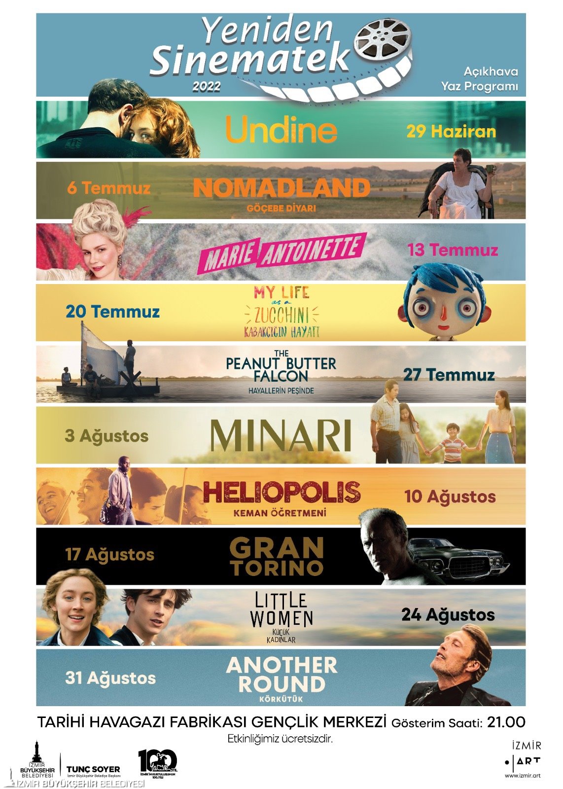 İzmir Büyükşehir Belediyesi’nin “Yeniden Sinematek” gösterimleri, yaz döneminde Tarihi Havagazı Fabrikası Gençlik Yerleşkesi’ndeki çim alanda izleyicilerle buluşacak. Temmuz ve Ağustos döneminde filmler ücretsiz olarak sinemaseverlerle buluşacak. Bugün ilk gösterimi olacak Yeniden Sinematek’in tüm filmleri saat 21.00’de başlayacak.