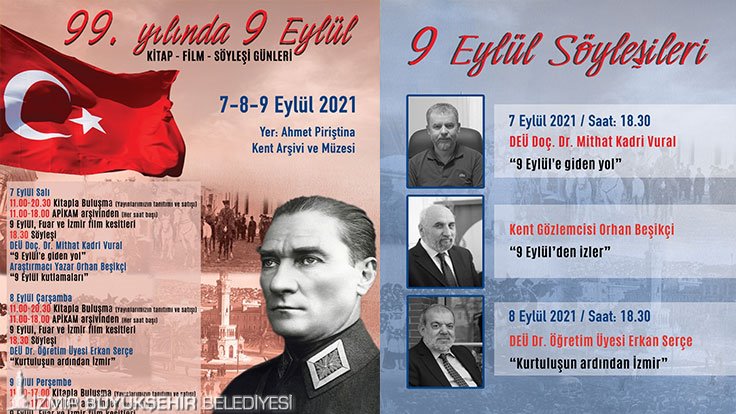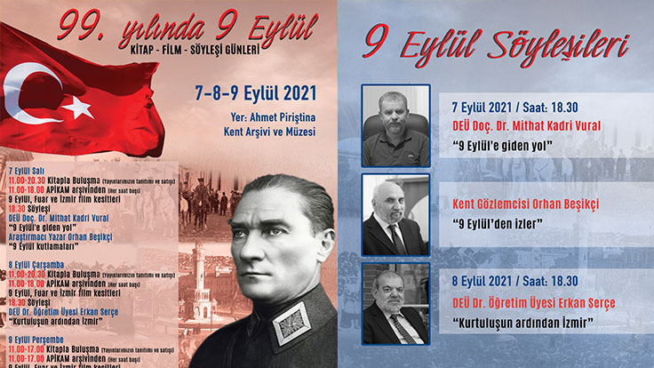 Ayrıca alanında uzman isimlerin konuk edileceği söyleşilerde 9 Eylül'ün öncesi ve sonrası derinlemesine ele alınacak. İlk gün (7 Eylül Salı) 18.30’da yapılacak söyleşide Kent Gözlemcisi Orhan Beşikçi “9 Eylül’den izler” ve Dokuz Eylül Üniversitesi Öğretim Üyesi Doç. Dr. Mithat Kadri Vural “9 Eylül'e giden yol” başlıkları çerçevesinde dönemi değerlendirecekler. İkinci gün ise ( 8 Eylül Çarşamba) Dokuz Eylül Üniversitesi Dr. Öğretim Üyesi Erkan Serçe “Kurtuluşun ardından İzmir” konulu söyleşiye konuk olacak. Söyleşilerin moderatörlüğünü APİKAM Koordinatörü Hasan Tahsin Kocabaş yapacak.