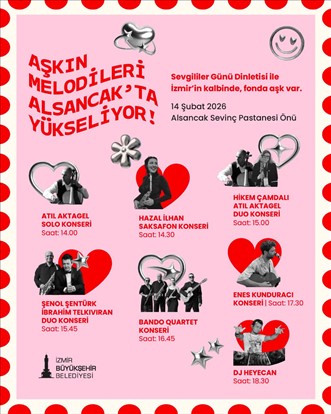 14 Şubat Sevgililer Günü, İzmir Büyükşehir Belediyesi tarafından Alsancak Kıbrıs Şehitleri Caddesi girişinde önünde müzikle kutlanacak. Saat 14.00’te başlayacak programda Atıl Aktagel, Hazal İlhan, Hikem Çamdalı-Atıl Aktagel, Şenol Şentürk-İbrahim Telkıvıran, Bando Quartet, Enes Kunduracı konserleri yapılacak. Saat 18.30’da ise DJ Heyecan sahne alacak. Etkinlik ücretsiz olacak