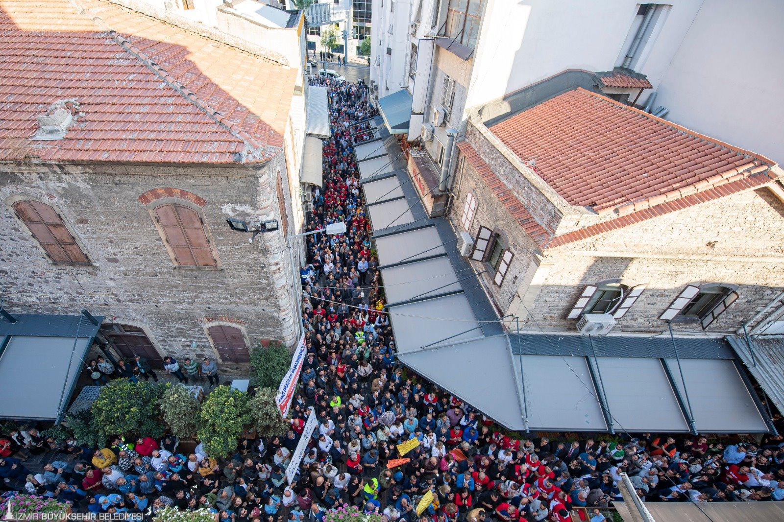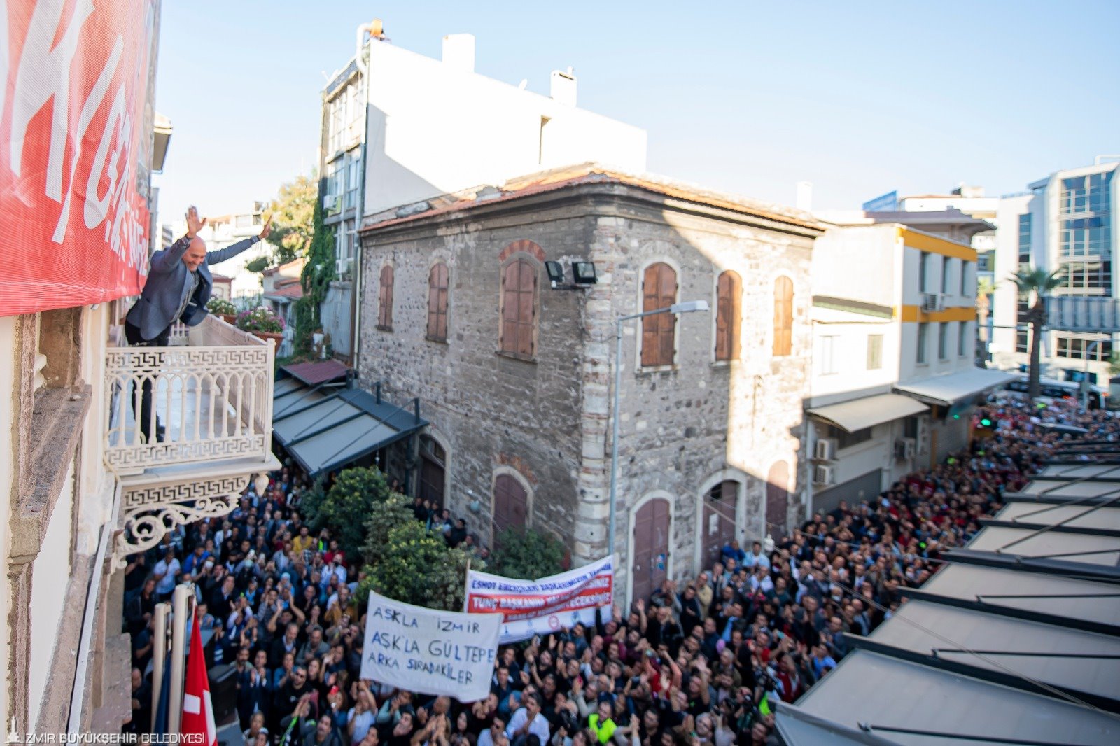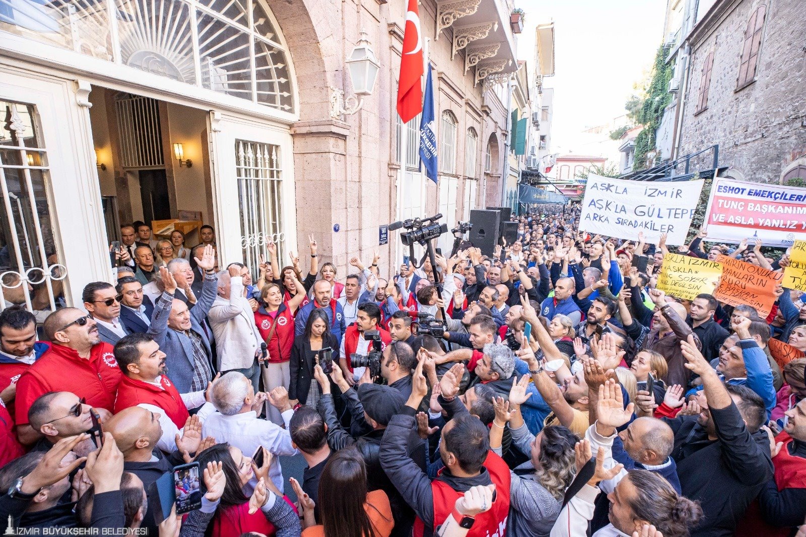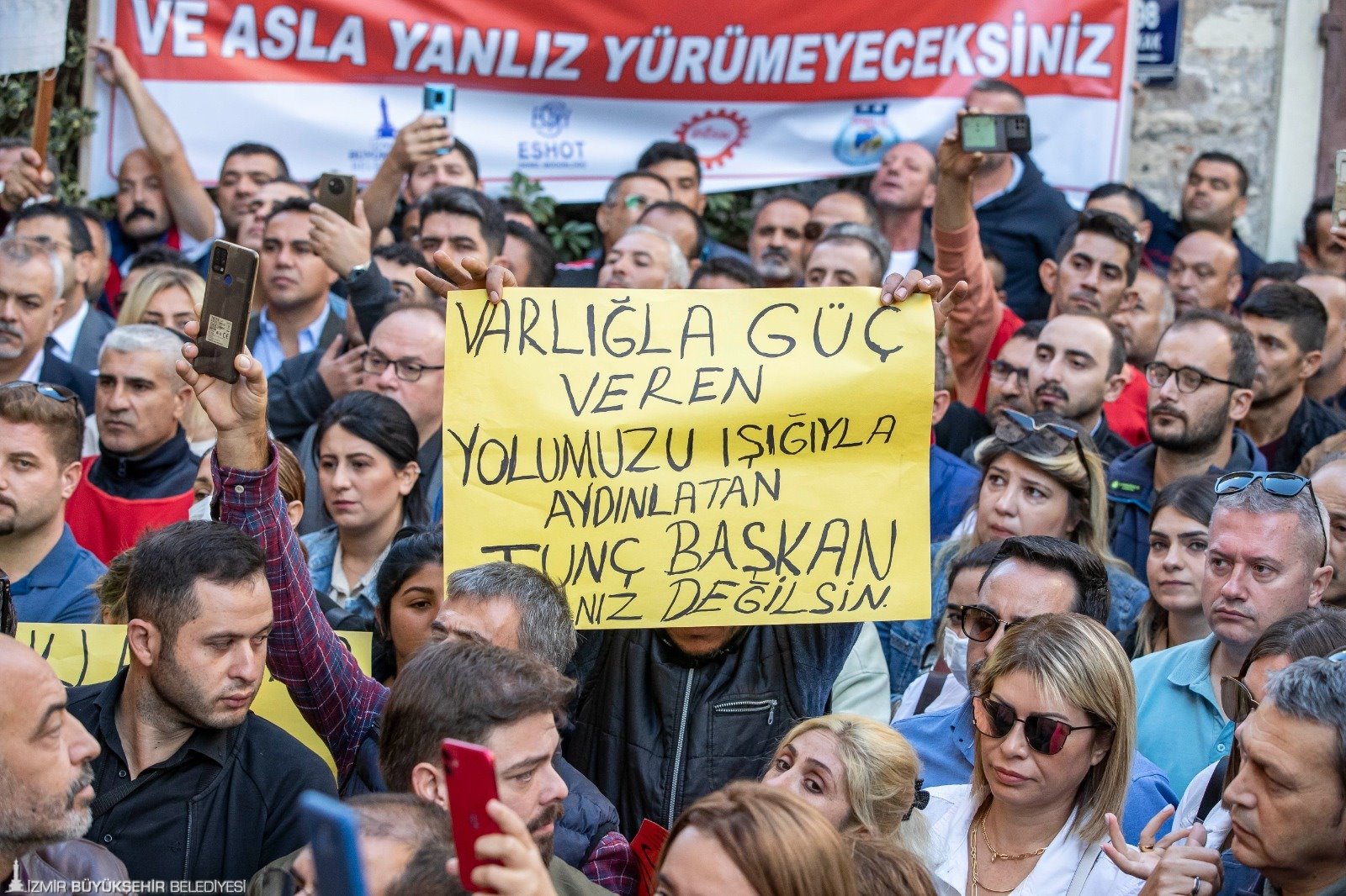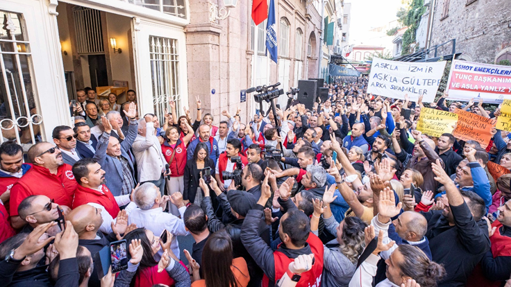 9 Eylül’deki tarihi kutlamaların ardından gelişen süreçte İçişleri Bakanlığı tarafından İzmir Büyükşehir Belediye Başkanı Tunç Soyer’e soruşturma izni verilmesinin ardından Devrimci İşçi Sendikaları Konfederasyonu’nda (DİSK) örgütlü belediye işçileri Başkan Tunç Soyer’e sahip çıktı. Konak’taki Tarihi Belediye Binası’nın önünde bugün mesai başlamadan toplanan işçiler, “Asla yalnız yürümeyeceksin”, “Birleşe birleşe kazanacağız”, “Kurtuluş yok tek başına, ya hep beraber ya hiç birimiz”, “Susmuyoruz, korkmuyoruz, itaat etmiyoruz” ve “Tunç Başkanı yedirmeyeceğiz” sloganları attı. Destek mitinginde “Tunç Başkan yalnız değilsin”, “Aşkla İzmir, aşkla Tunç Soyer”, “Memleket sevdalısı Tunç Başkan”, “Varlığıyla bize güç veren yolumuzu ışığıyla aydınlatan Tunç Başkan yalnız değilsin” yazılı dövizler taşındı.