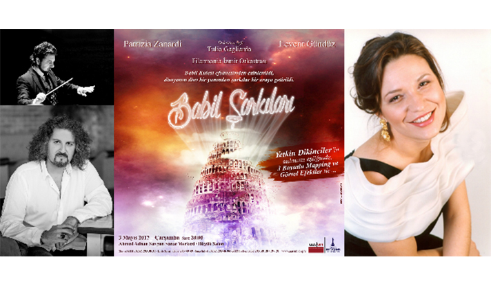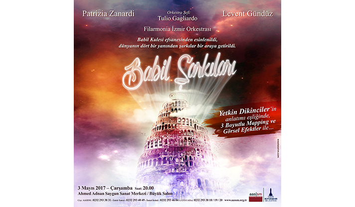 Dünya yıldızlarını İzmirlilerle buluşturan İzmir Büyükşehir Belediyesi Ahmed Adnan Saygun Sanat Merkezi’nde (AASSM), bu kez Babil Kulesi Efsanesi’nden yola çıkılarak hazırlanmış ve 20 farklı ülkenin sevilen eserlerinden oluşan Babil Şarkıları yankılanacak. Ülkelerin kendi dillerden ve kültürlerinden özenle seçilerek hazırlanan zengin repertuvar, büyülü bir atmosferde, 3 boyutlu mapping ve görsel şovlarla sahnelenecek. 64 kişilik Filarmonia İzmir Orkestrası'nın eşlik edeceği, Soprano Patrizia Zanardi ve Tenor Levent Gündüz'ün seslendireceği konserin şefi Tulio Gagliardo olacak. Tiyatro ve sinema sanatçısı Yetkin Dikinciler'in Babil Kulesi efsanesi anlatımı ve sunumları sayesinde mistik bir atmosferde geçecek konser, 3 Mayıs Çarşamba günü saat 20.00’de Büyük Salon’da.