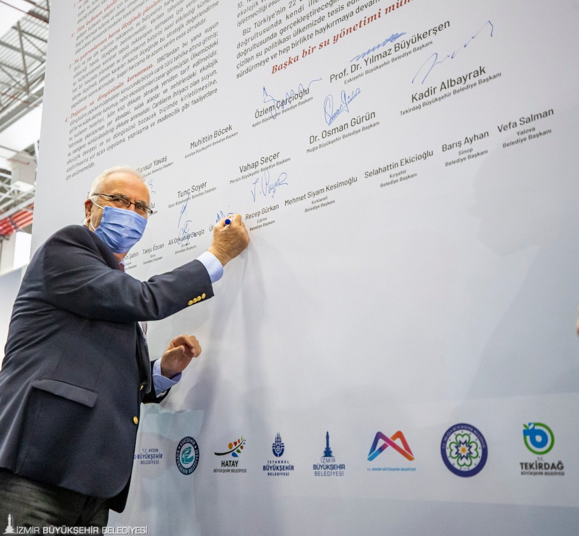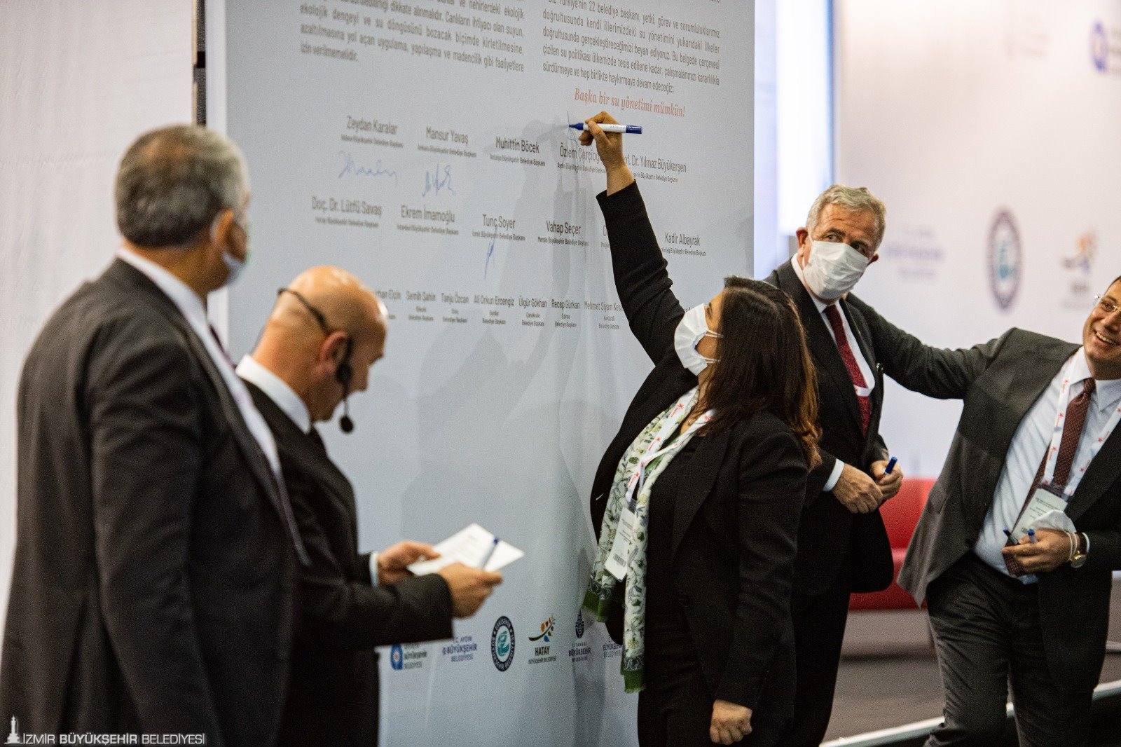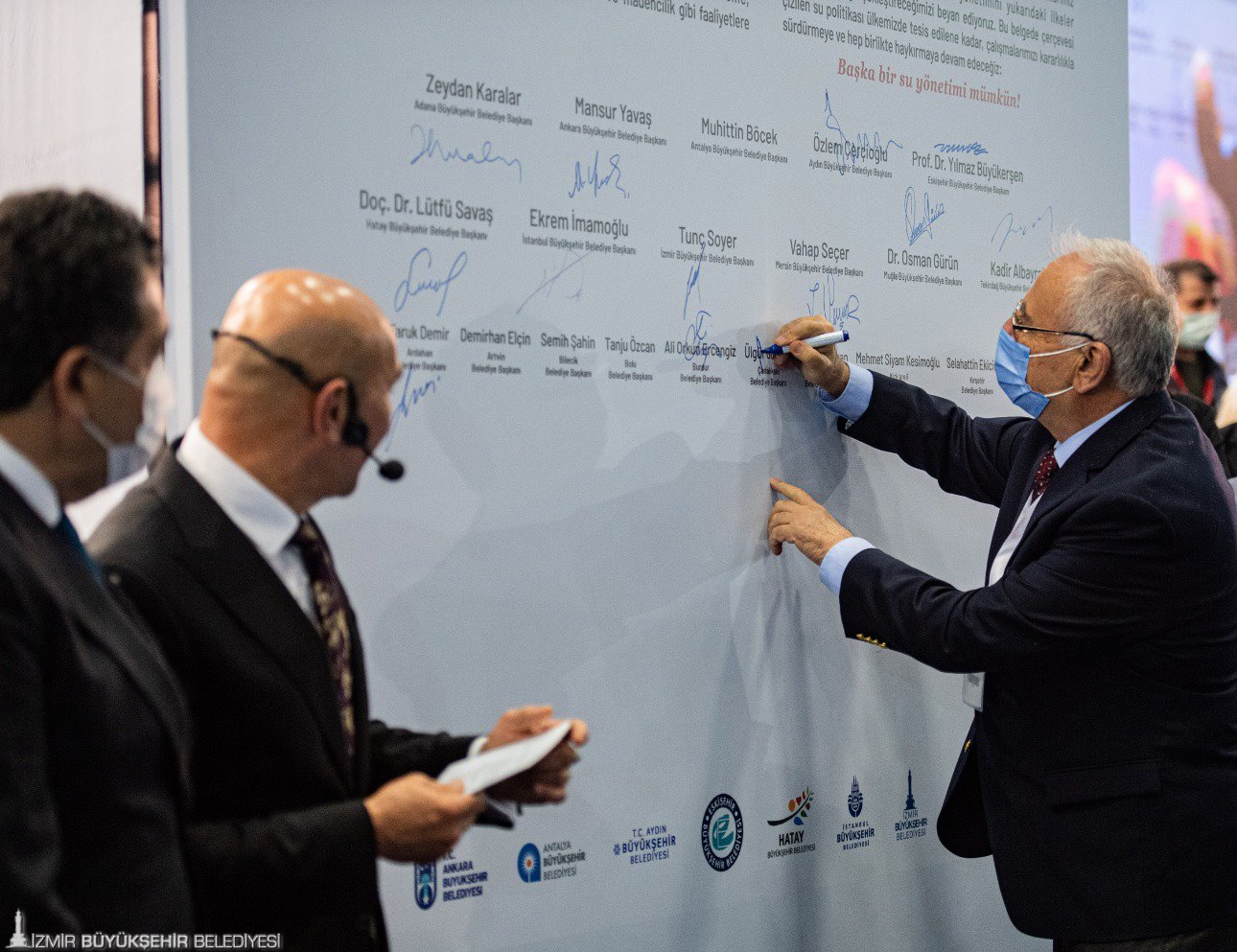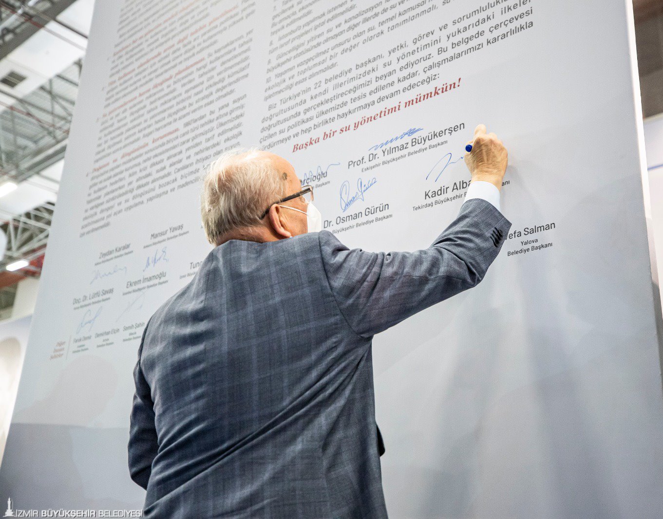 Bizler Türkiye’nin 11 büyükşehir belediyesinin ve 11 il belediyesinin başkanları, bu vicdani ve bilimsel sorumluluktan hareketle bugün, 22 Mart 2021’de, Dünya Su Günü’nde İzmir’de buluştuk. Amacımız, iklim krizinin ağırlaşan sonuçlarını da dikkate alarak Türkiye için başka bir su politikası önermek ve bu topraklarda geleceğimizi, çocuklarımız ve doğamız için güvence altına almaktır.