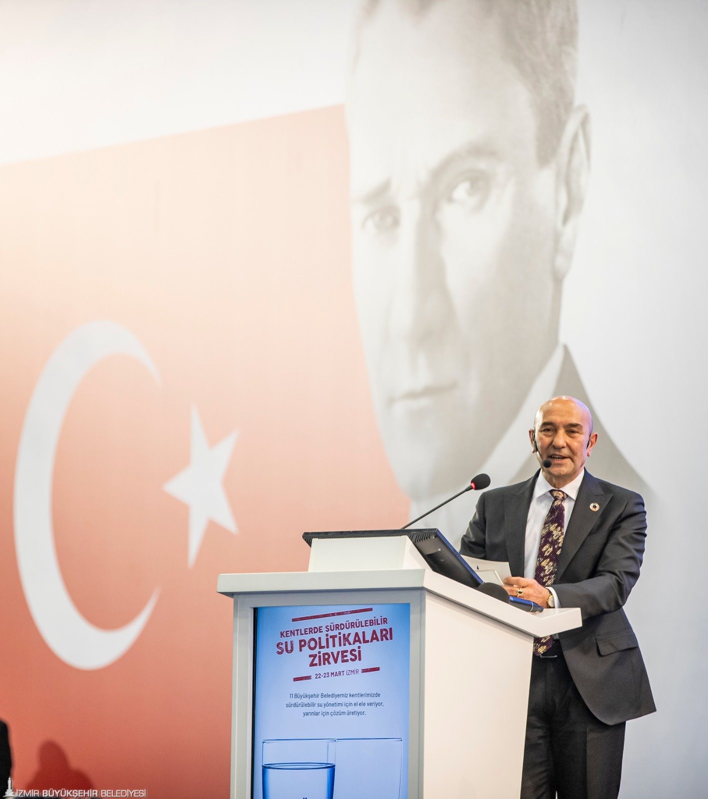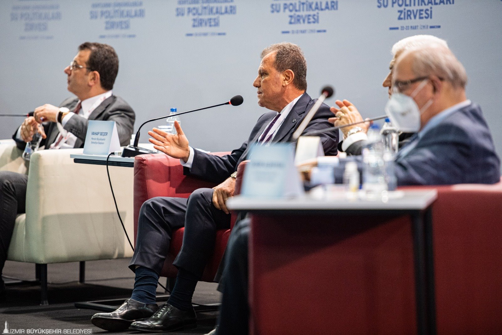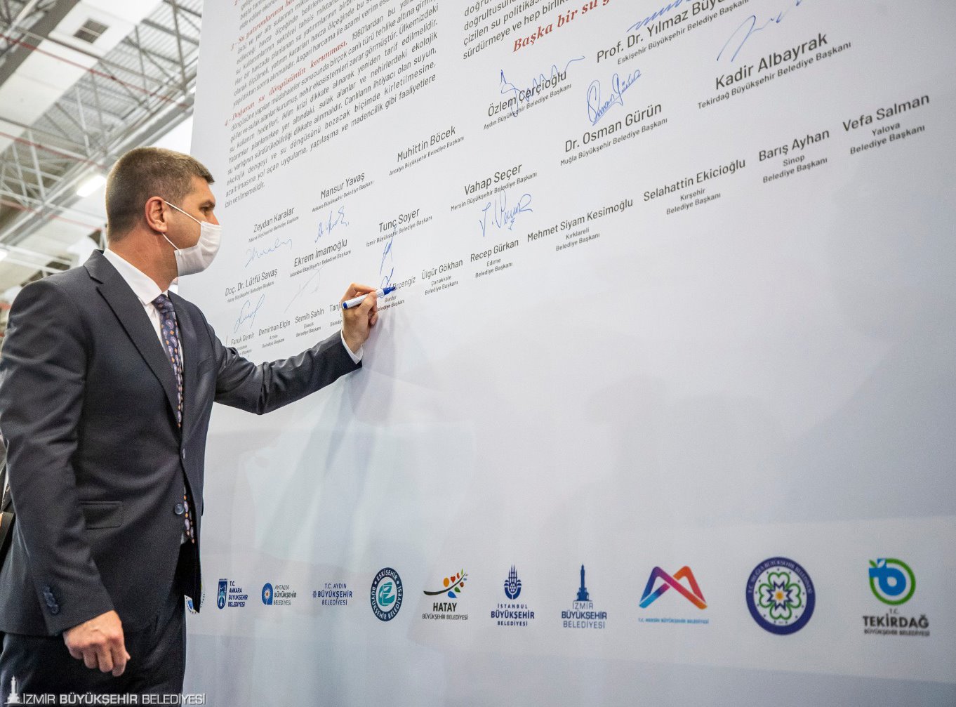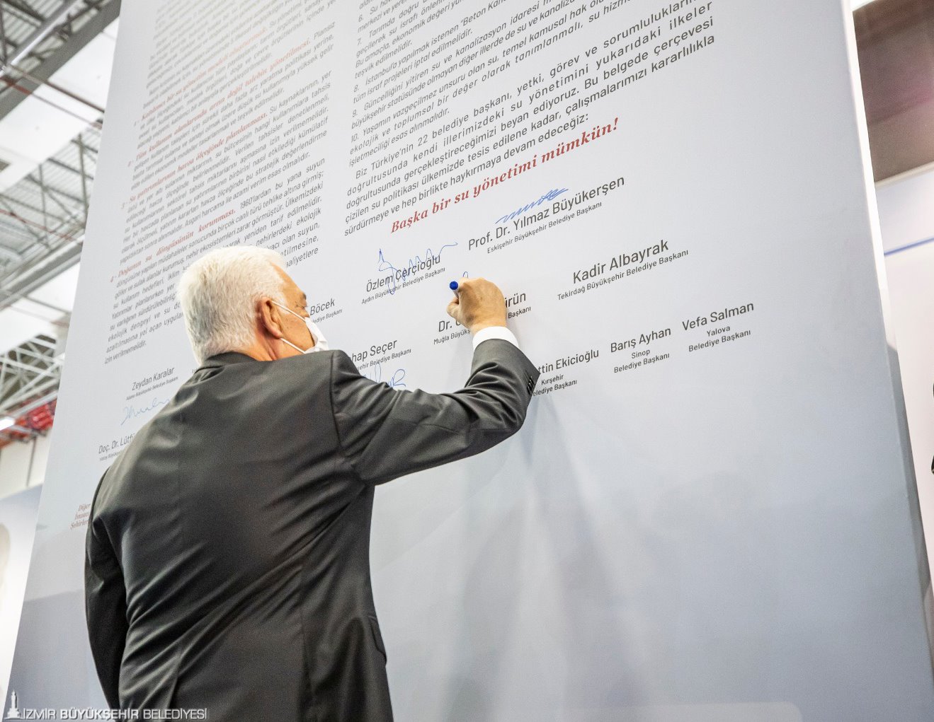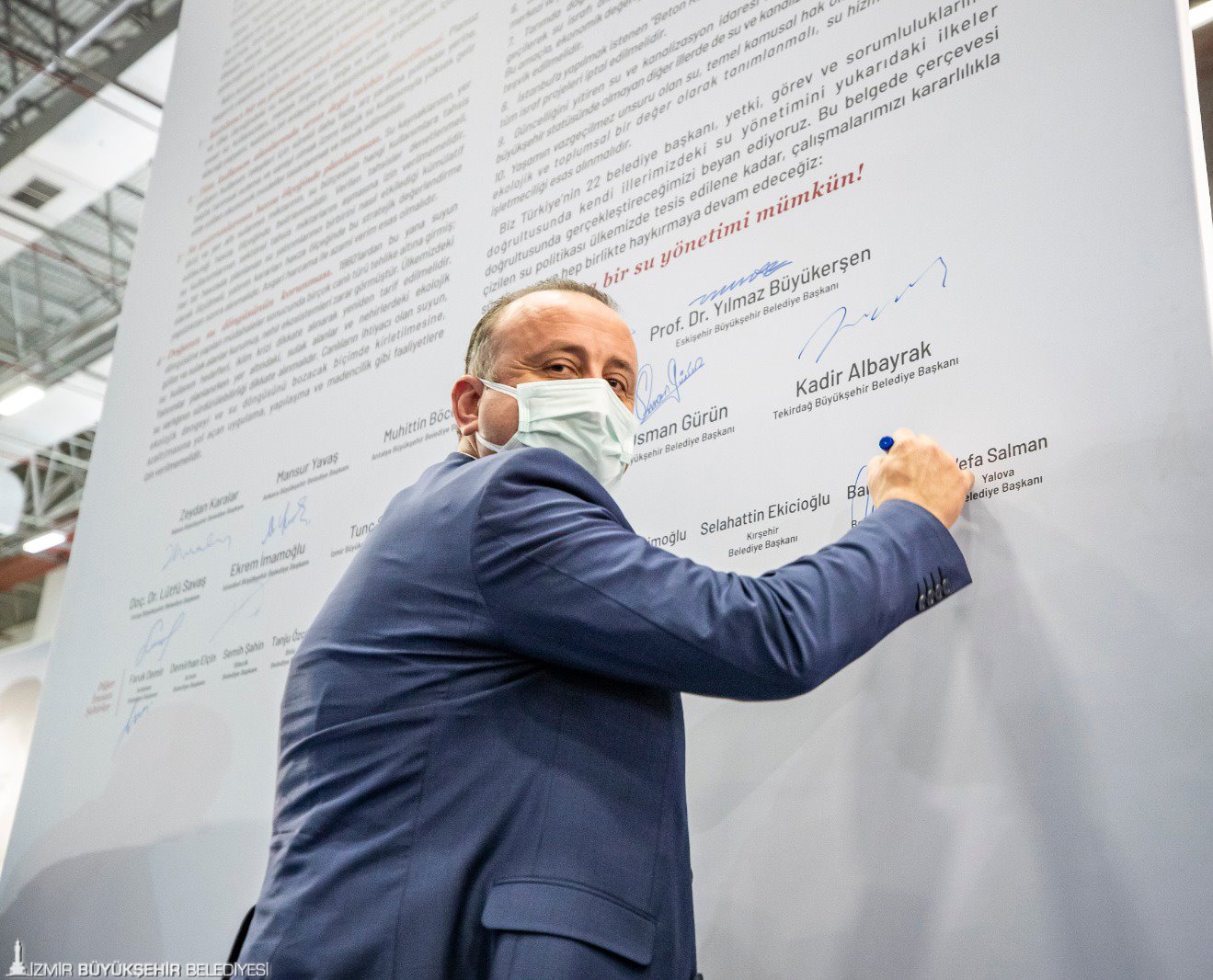 Bizler Türkiye’nin 11 büyükşehir belediyesinin ve 11 il belediyesinin başkanları, bu vicdani ve bilimsel sorumluluktan hareketle bugün, 22 Mart 2021’de, Dünya Su Günü’nde İzmir’de buluştuk. Amacımız, iklim krizinin ağırlaşan sonuçlarını da dikkate alarak Türkiye için başka bir su politikası önermek ve bu topraklarda geleceğimizi, çocuklarımız ve doğamız için güvence altına almaktır.