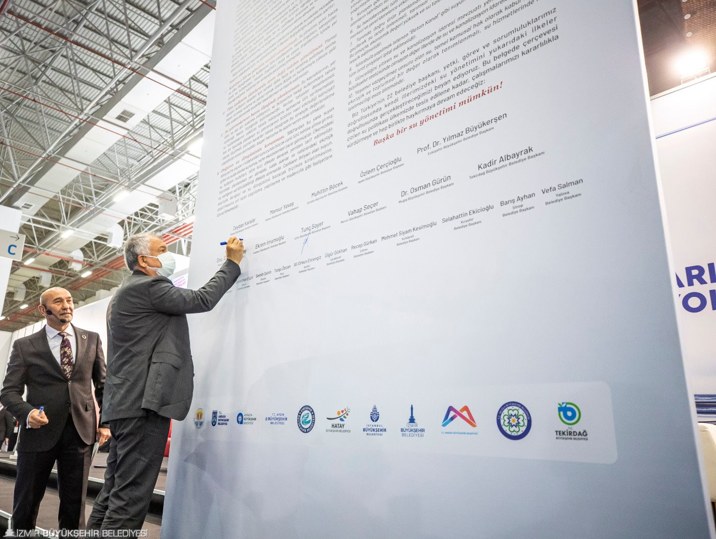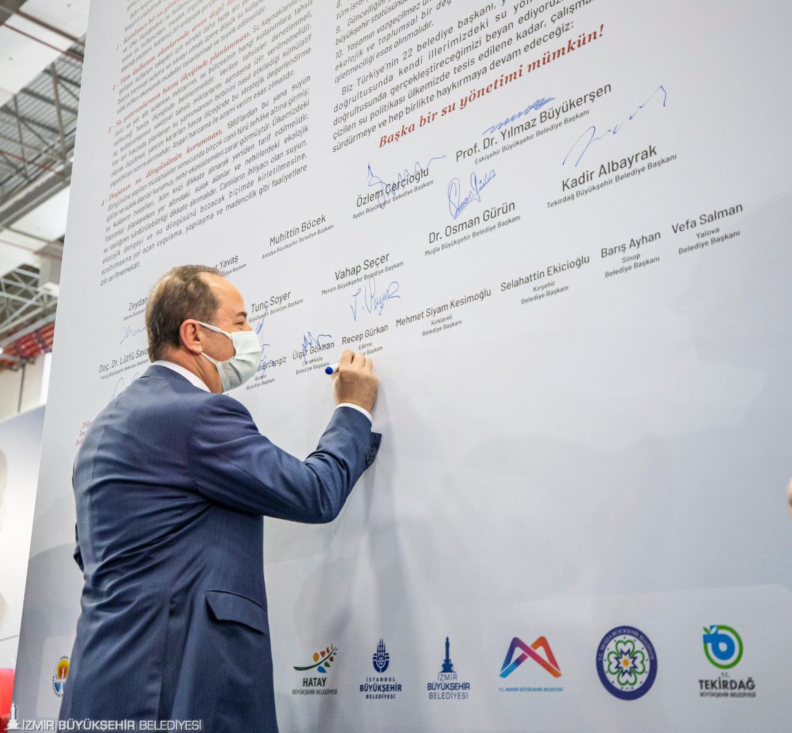Biz Türkiye’nin 22 belediye başkanı, yetki, görev ve sorumluluklarımız doğrultusunda kendi illerimizdeki su yönetimini yukarıdaki ilkeler doğrultusunda gerçekleştireceğimizi beyan ediyoruz. Bu belgede çerçevesi çizilen su politikası ülkemizde tesis edilene kadar, çalışmalarımızı kararlılıkla sürdürmeye ve hep birlikte haykırmaya devam edeceğiz: Başka bir su yönetimi mümkün!”